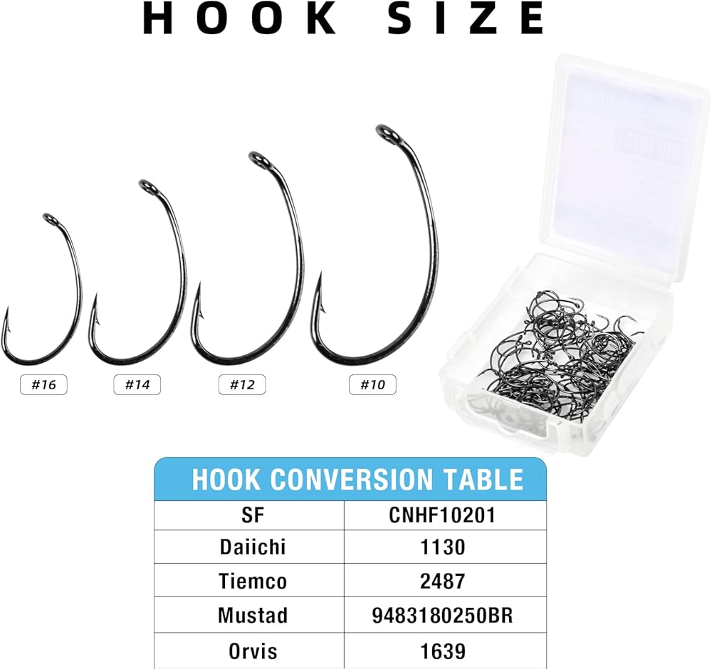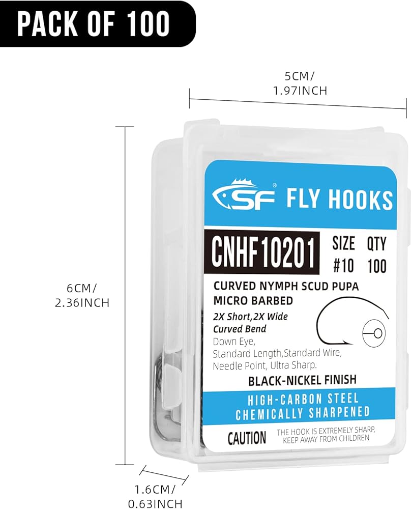Packed in a box: SF curved nymph scud pupa hooks packed in a small box (2.36*1.88*0.59inch), will meet all your needs and are very convenient to store.