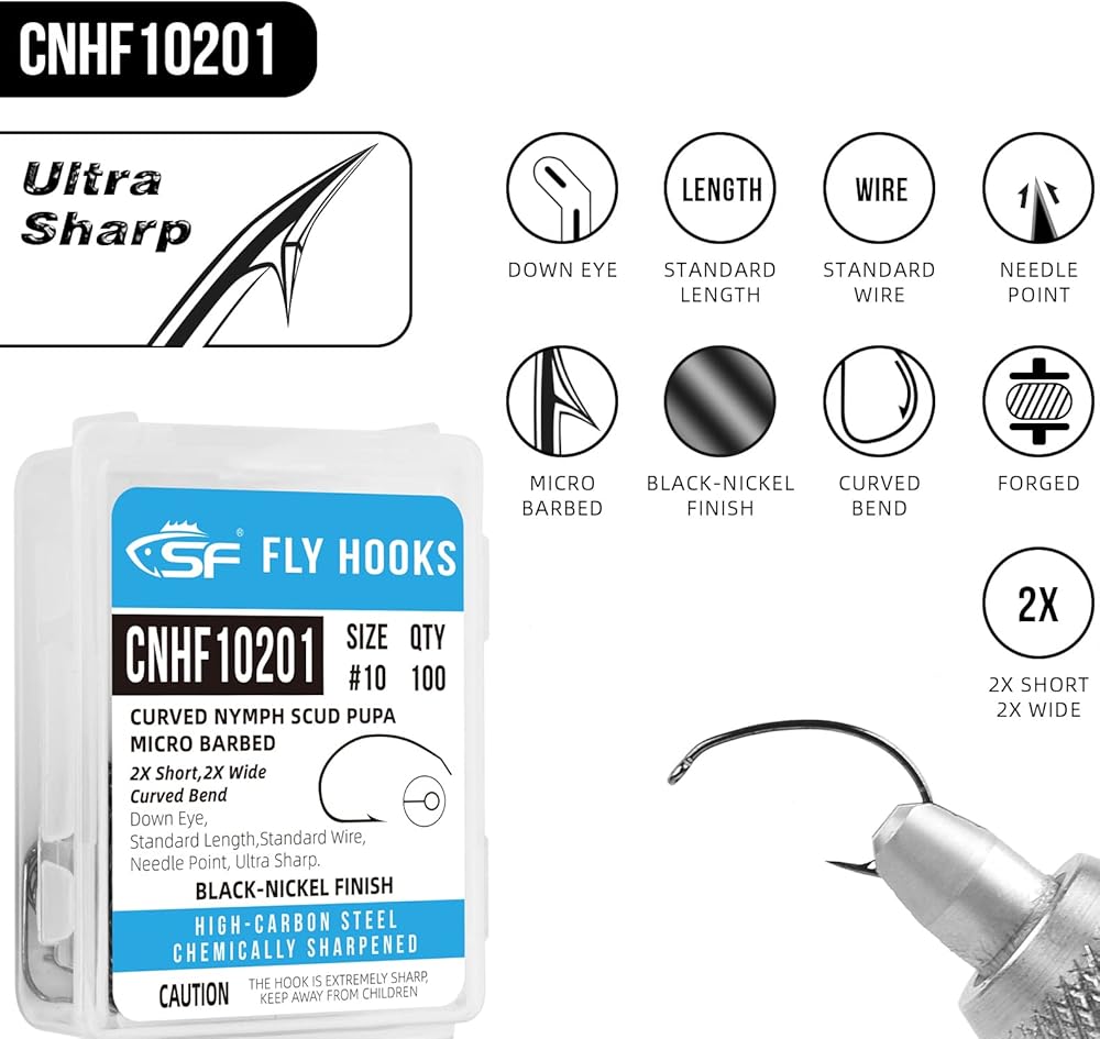 Features: SF Curved Nymph Scud Pupa hook with a needle point micro barb and a black nickel finish to stay sharp and resist corrosion.