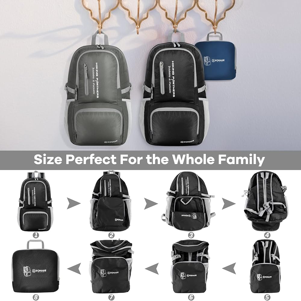 LARGE CAPACITY LIGHTWEIGHT FOLDABLE BACKPACK 35L: Our foldable hiking backpack capacity is 35L,with large capacity and many pockets.There is a main bag in the foldable daypack,and there are compartments in the main bag,which can be installed and clothes and washing products;There are 3 front bags that can store mobile small equipment.Two side bags store water bottles and umbrellas.There are protective buckle bands from the side bag to avoid the drop of umbrellas and water bottles