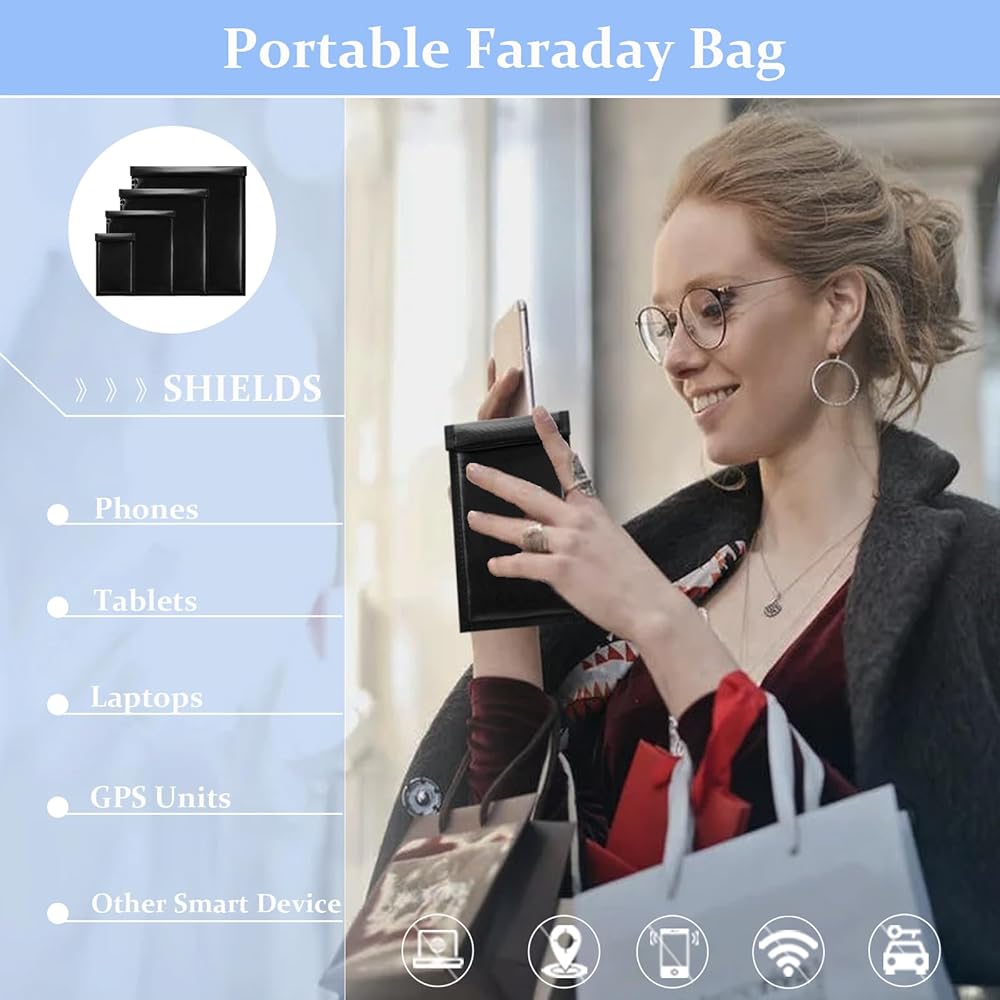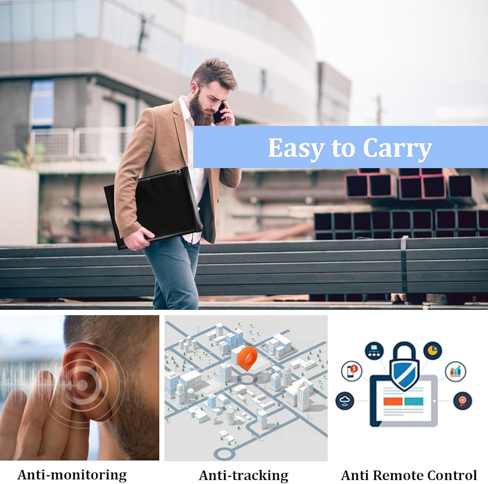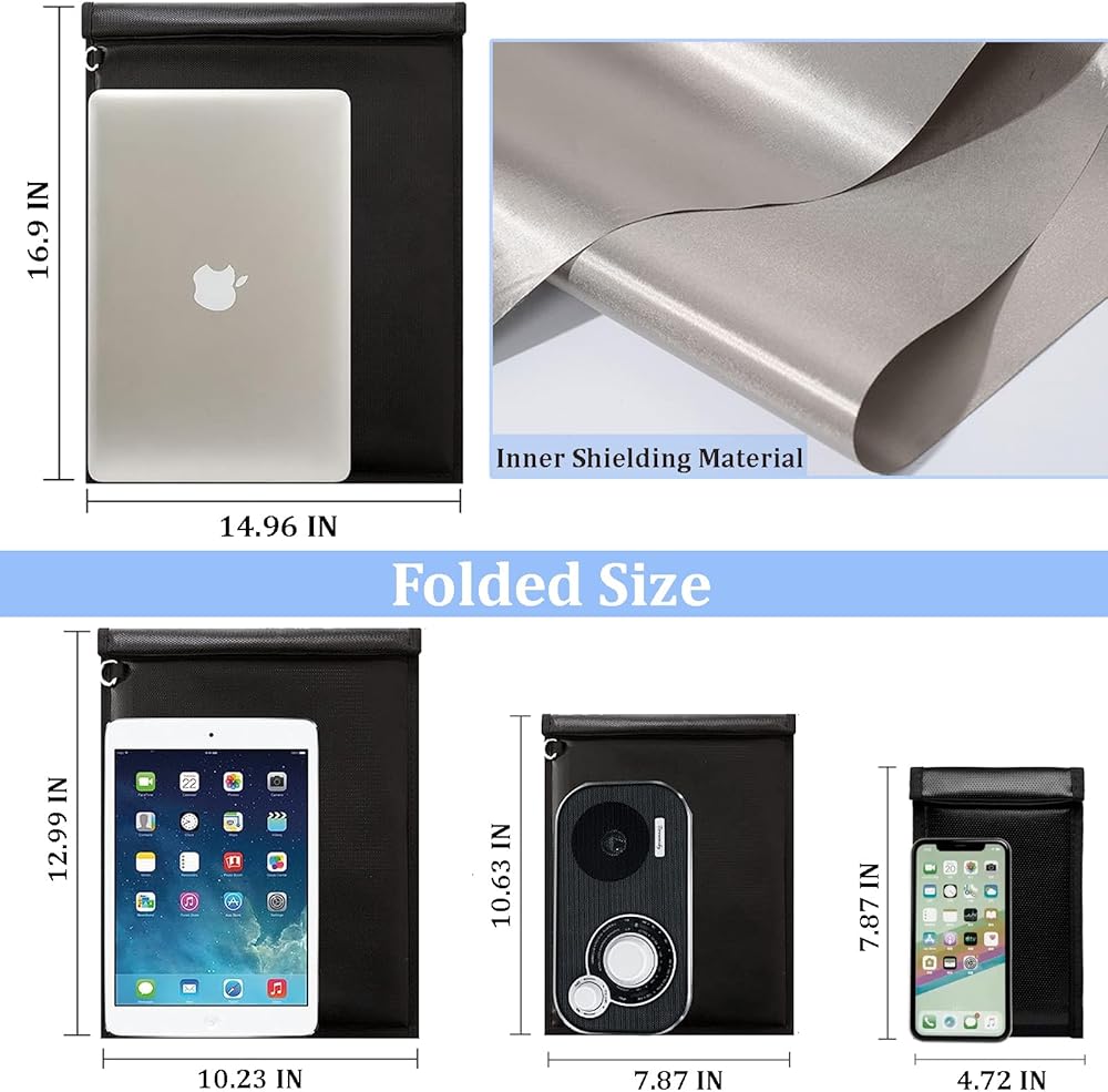 【3 Sizes Faraday Bags Meet Your Needs】The Large faraday bag folded size is 16.9 x 15 inches, fits all kinds of laptops, tablets, documents, GPS devices and other electronic devices. Medium faraday cage folded size is 12.99 x 10.23 inches, fits tablets, cards, cash, ID cards. Small faraday key fob protector folded size is 7.87 x 4.72 inches,fits car keys, Phones, cards, cash.