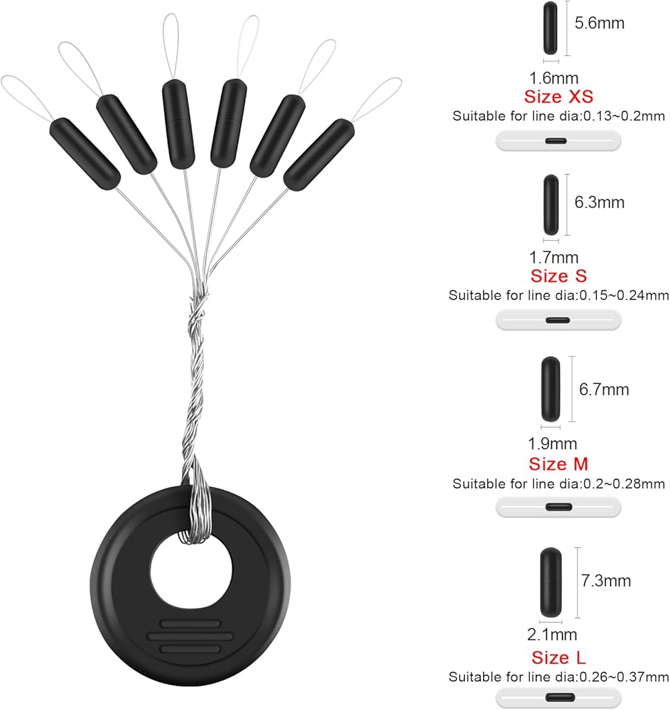 Multiple Size Options: This bobber stoppers for fishing line comes in 4 sizes to select. Size XS Suitable for Line Dia: 0.13~0.2mm; Size S Suitable for Line Dia: 0.15~0.24mm; Size M Suitable for Line Dia: 0.2~0.28mm; Size L Suitable for Line Dia: 0.26~0.37mm.