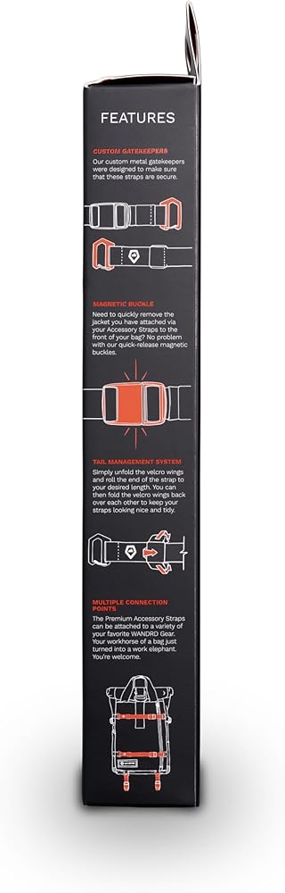 Roll-and-Velcro Webbing Tail Management System: Say goodbye to loose ends and tangled straps. Our new roll-and-velcro webbing tail management system keeps your Premium Accessory Straps looking neat and ensures hassle-free organization for your travel essentials