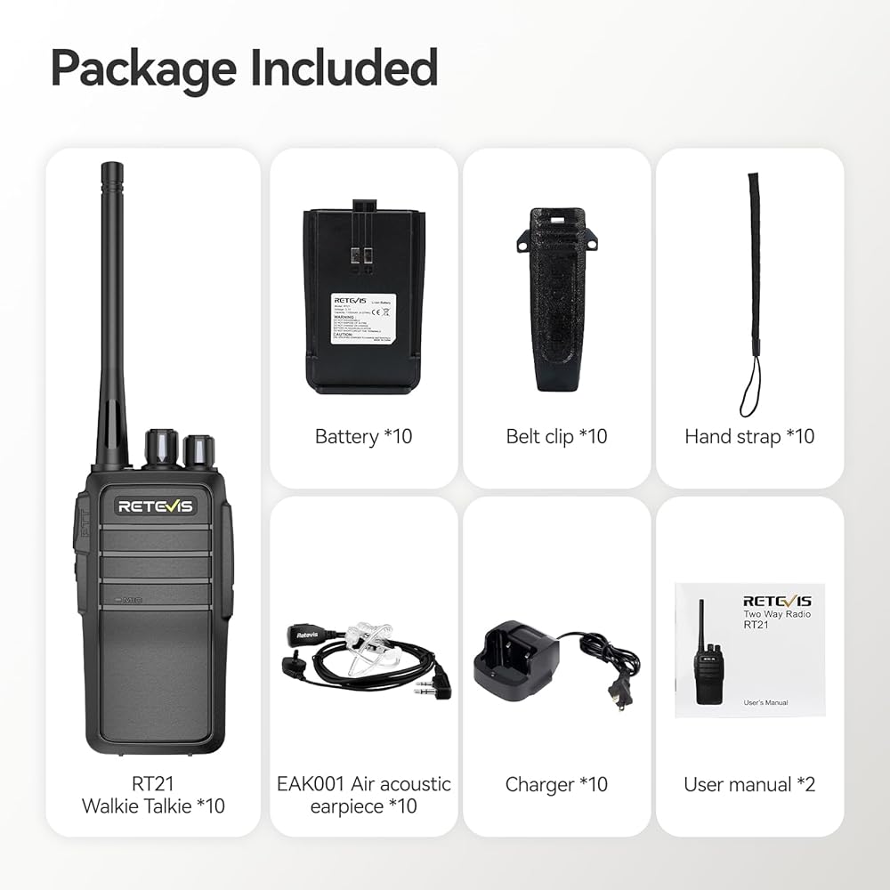 All RT21 walkie talkies for adults has been set well could use directly when out of box; emergency alarm will protect your safety when you work alone