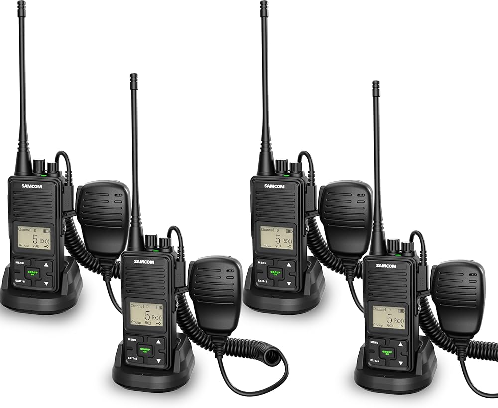 【UHF Walkie-Talkies with Shoulder Mic Sets】The packages includes :SAMCOM 2 Way Radio x4, Speaker Mic x 4, 3000mAh Battery x4, Long Antenna (6.7 inches) x4, K-Type Earpiece x4, Dock Charger (US Standard) x4, Belt Clip x4