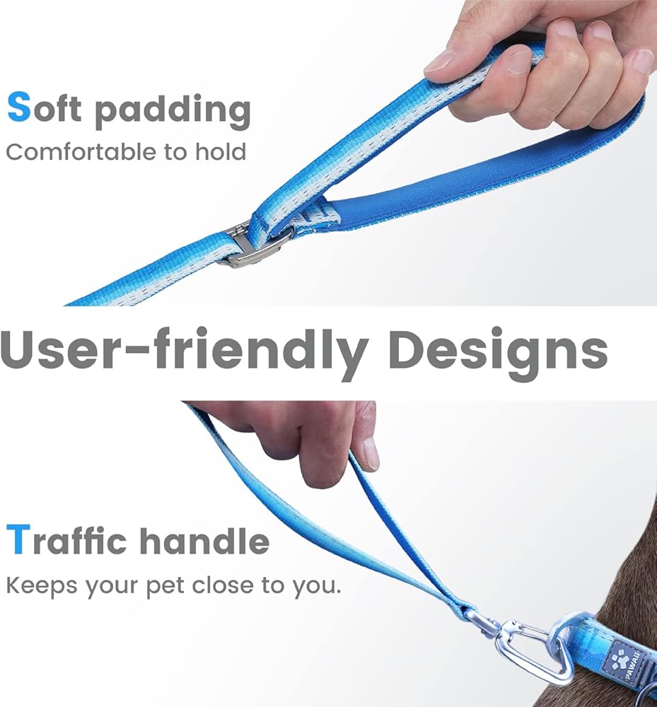 𝐔𝐬𝐞𝐫-𝐟𝐫𝐢𝐞𝐧𝐝𝐥𝐲 & 𝐩𝐞𝐭-𝐟𝐫𝐢𝐞𝐧𝐝𝐥𝐲: The no-pull dog collar is breathable and comfortable to wear without chafing. The dog collar and leash set also comes with a multi-functional attachment accessory and anti-lost ID tag. The soft neoprene fabric allows you to hold it for a long time without rope burn. Coupled with a traffic handle, this dog leash can help to control your dog during emergencies.