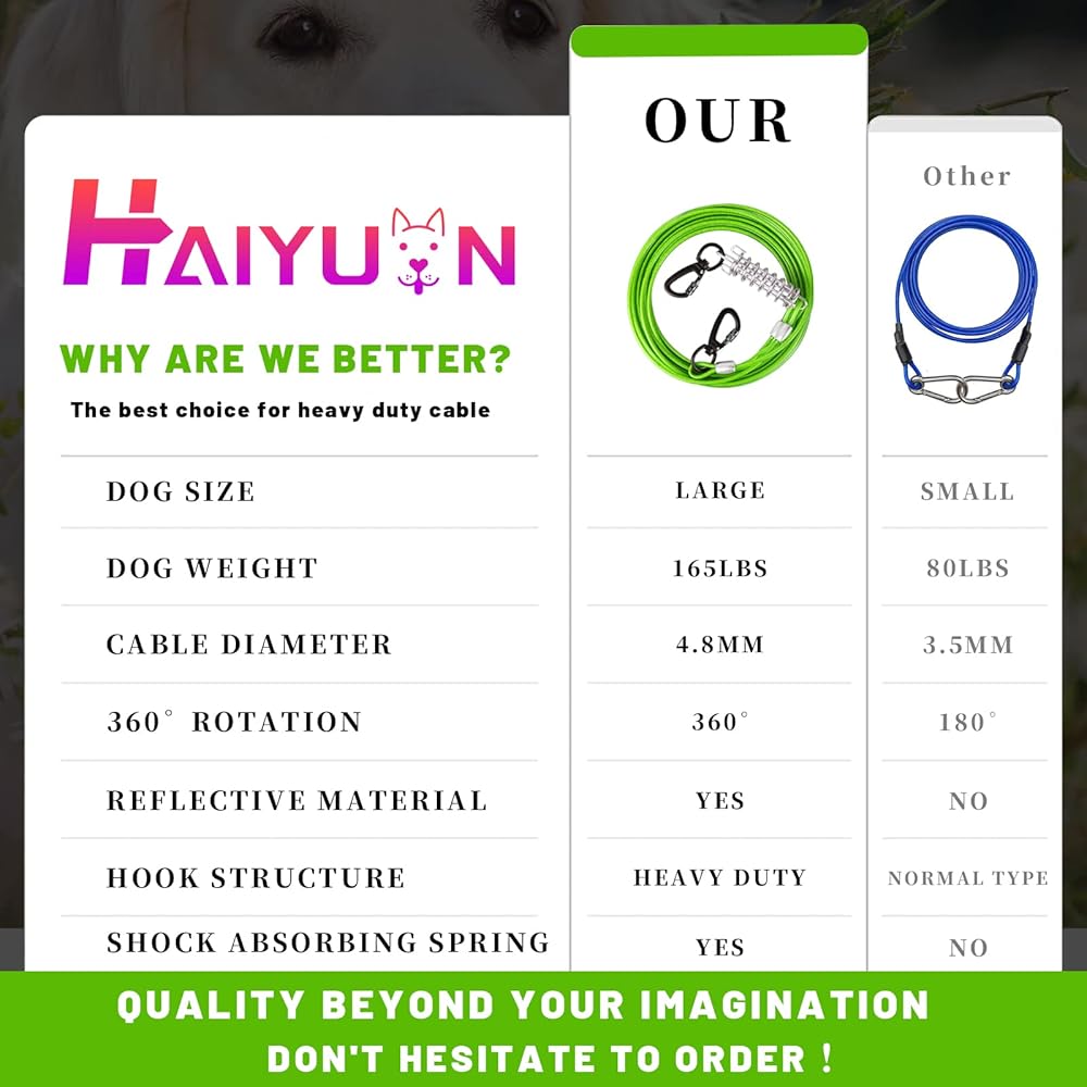STURDY DOG TIE OUT CABLE:The HaiYUAN multi-functional, multi-size, ultra-tensile pull cable provides greater range of motion for dogs. Designed for large, medium and small dogs up to 165 lbs.