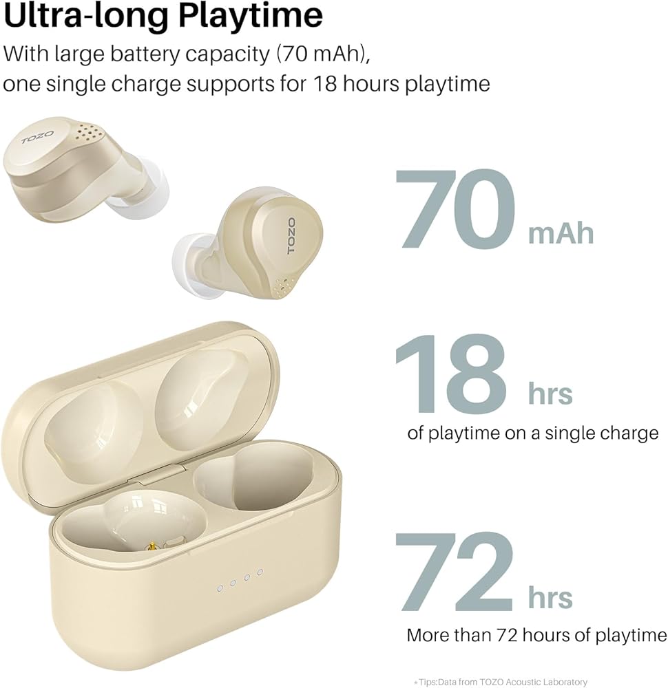 【72-Hour Ultra-long Playtime】The TOZO NC7 earbuds are compact and exquisite in design, comfortable to wear. Despite their small size, they are equipped with a large 70mAh lithium battery and consume ultra-low power, allowing them to achieve 18 hours of playback time on a single charge and up to 72 hours of ultra-long playback time when used with the wireless charging case, and it support USB A to USB C cable fast charging and wireless charging.