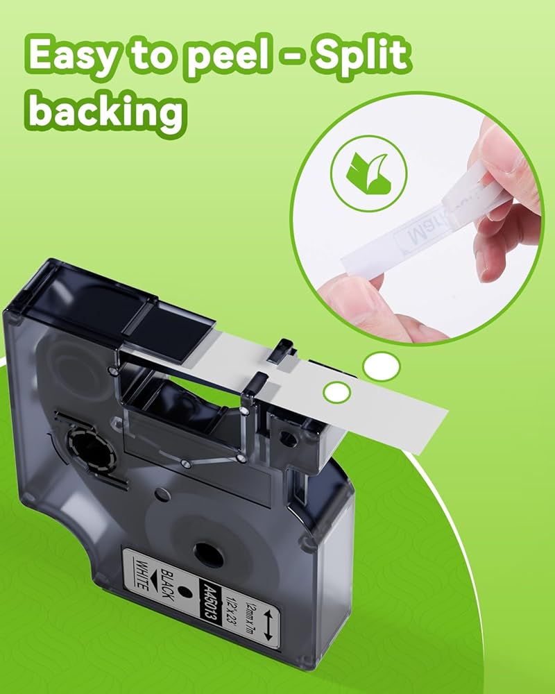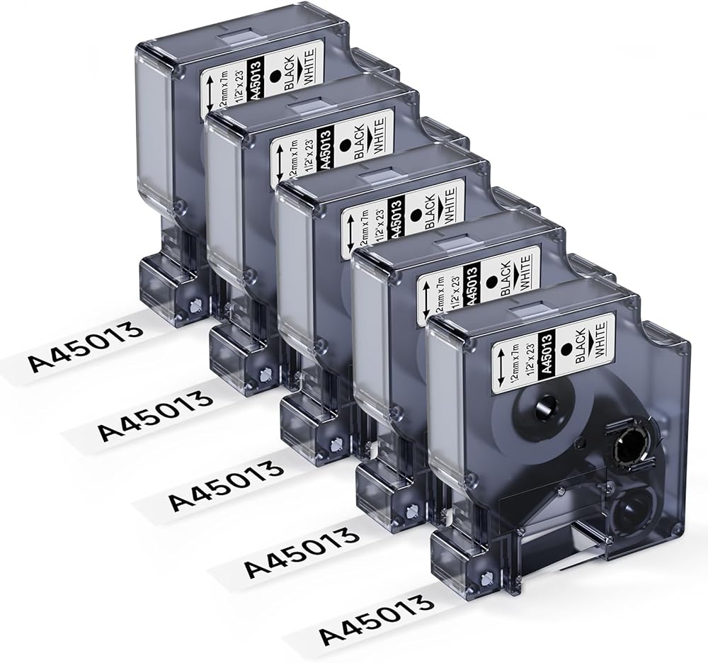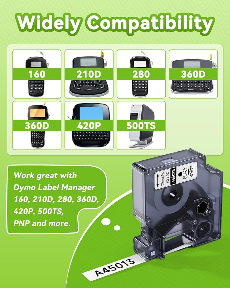 Easy to Clean: Our replacement for DYMO 45013 black on white label tape are removed without leaving any adhesive remnant. Will not cause any trouble to your cleaning task.