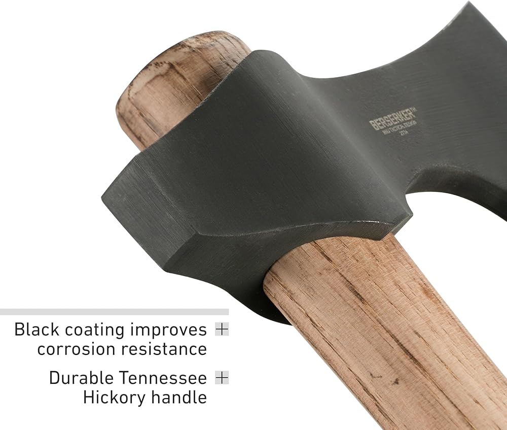 A battle cry in axe form. Get a glance of the Berserker /bur-zur-kr/ Viking-style axe and you know troubles coming; if youre an unsplit round, that is. The long cutting edge of the bearded axe blade is a powerful companion for big-swing jobs, fine slicing, and everything in between. For designer Ryan Johnson of RMJ Tactical, the well of creative inspiration is bottomless. The proof is in this powerfully distinct Viking-style axe that still features distinct Ryan Johnson design touches. The utilitarian bearded edge is built for taking a big bite out of a sapling, but choke up on the Tennessee hickory handle and the carbon steel blade readily slices a thick tomato for your cast iron creation. A traditional Viking axe makes for an anything-but-typical camping companion. Specifications: Blade Length: 4.65" (118.06 mm) | Edge: Axe w/Hammer | Steel: 1055 Carbon Steel | Blade Finish: Manganese Phosphate Coating | Blade Thickness: 1.57" (39.95 mm) | Open Length: 19" | Weight: 2.07 lb (0.94 kg) | Handle: Tennessee Hickory | Style: Axe