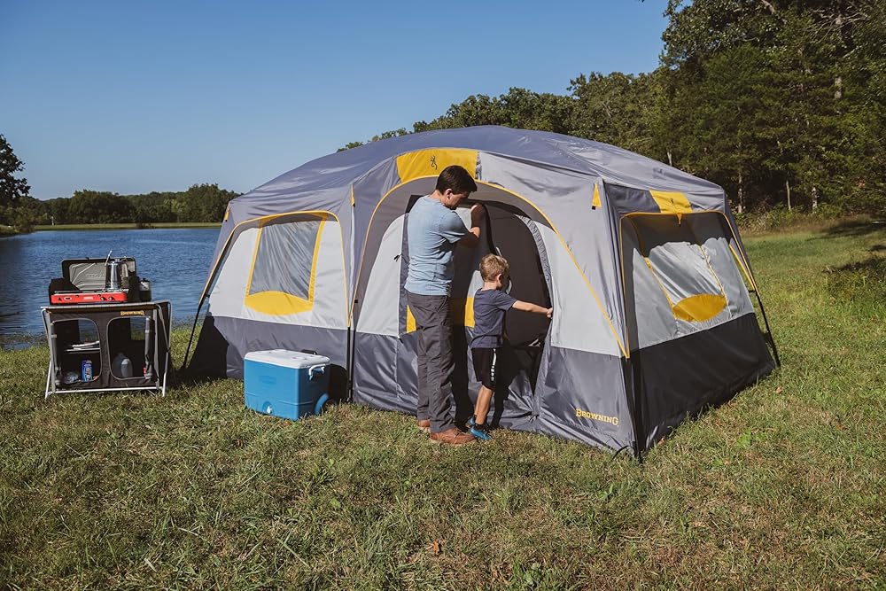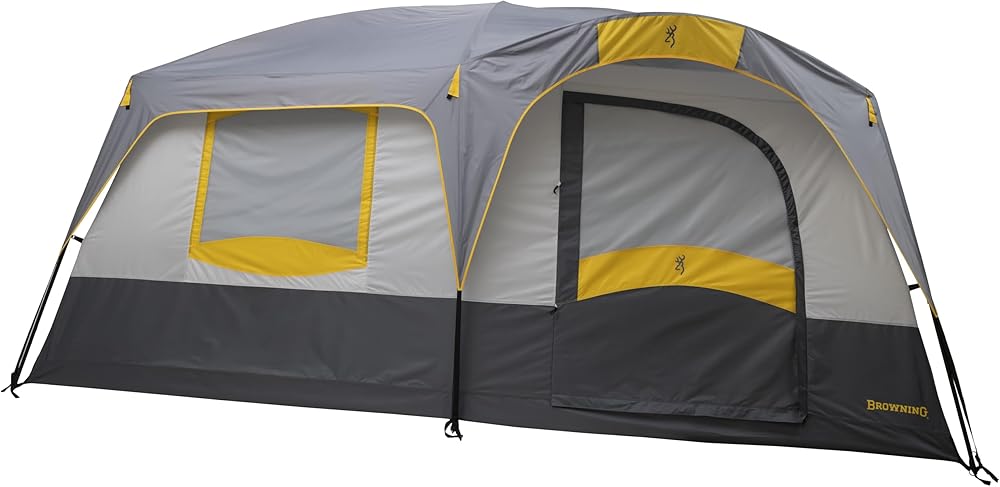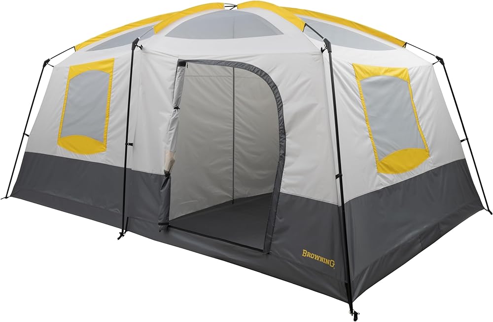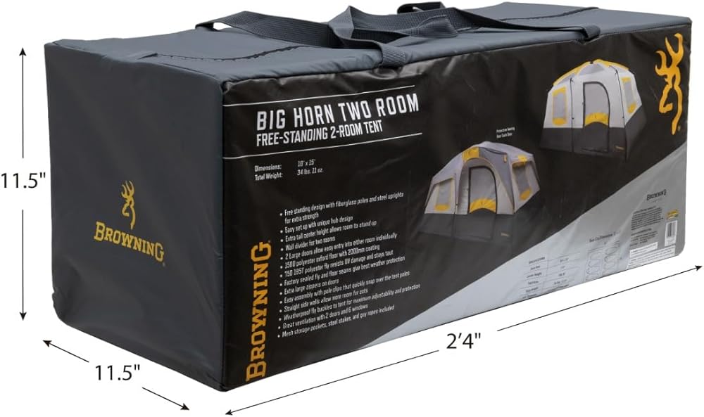 The Big Horn Tent Series from Browning Camping gives a whole new meaning to home away from home! Using fiberglass poles and steel uprights, the Big Horn Tents boasts a free-standing cabin tent design that is sure to withstand all the elements and conditions that it's put up against. Forget kneeling and crawling—its extra-tall center height makes changing clothes or getting ready for bed as easy as if you were in your bedroom. In addition to the extra-tall ceiling, straight side walls allow more room for cots, side tables or whatever else you may want in your tent. Large doorways and windows allow for easy access and great ventilation. The Big Horn Tents are equipped with factory-sealed fly and floor seams for optimal wet-weather protection, and the fly is securely held into place using weatherproof buckles for maximum adjustability. The Big Horn is ready for your next campout, hunting trip or backyard adventure. Don't forget to add a footprint to protect your tent floor.