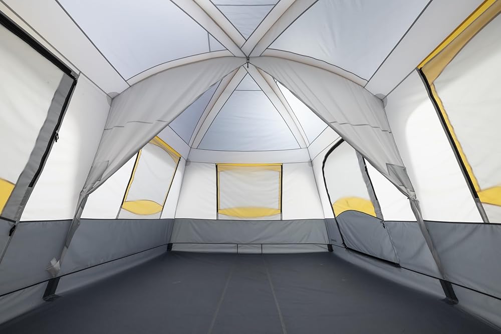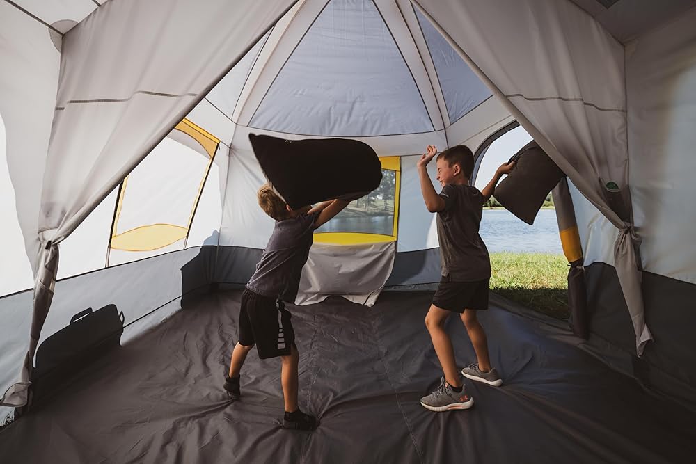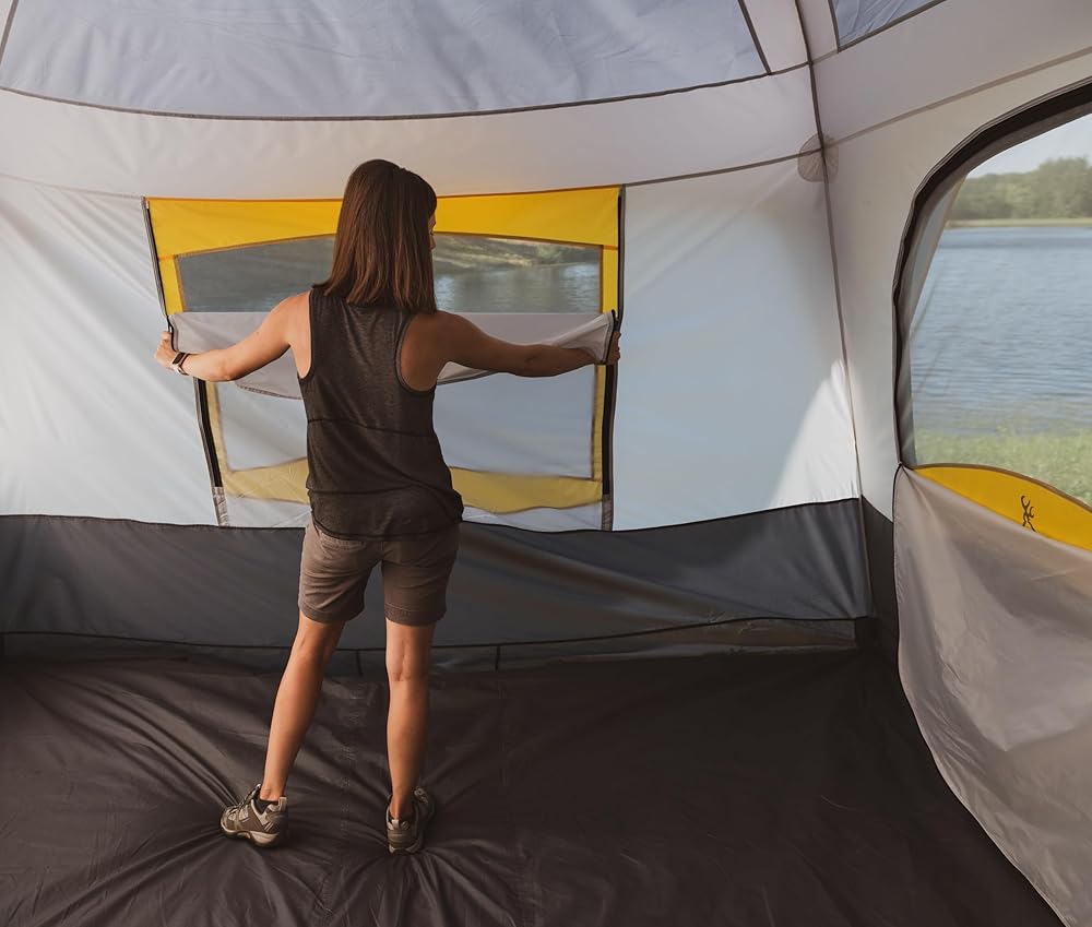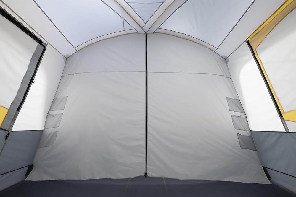 LARGE DOORS: easy entry with awnings over doors for extra weather protection; OPTIONAL ROOM DIVIDER: wall divider splits tent in half for two usable spaces