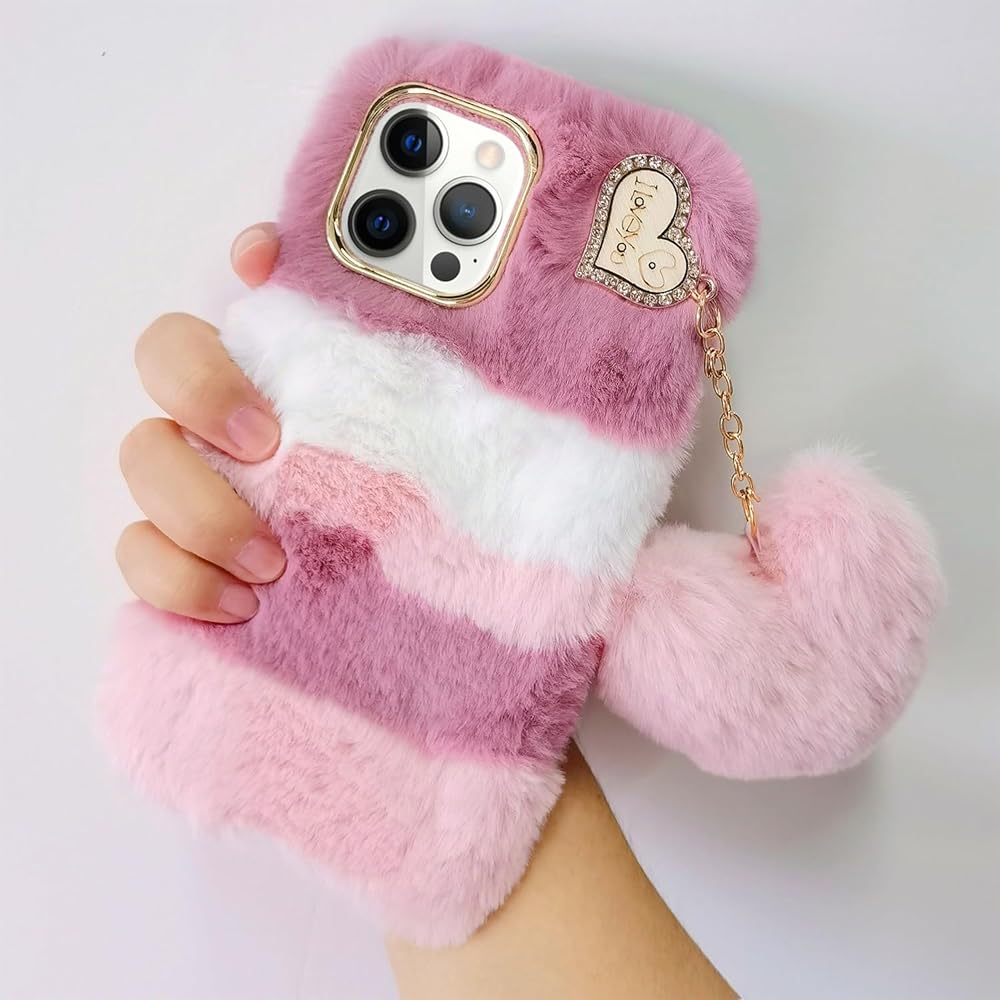 DESIGN: The camera lens ring is adorned with sparkling diamonds, adding a touch of sparkle and elegance to your device. This 3D heart shaped plush pendant is not only stylish, but also very cute and guaranteed to receive lots of compliments wherever you go. In addition, the soft and cozy rabbit fur will keep your hands warm in the winter.