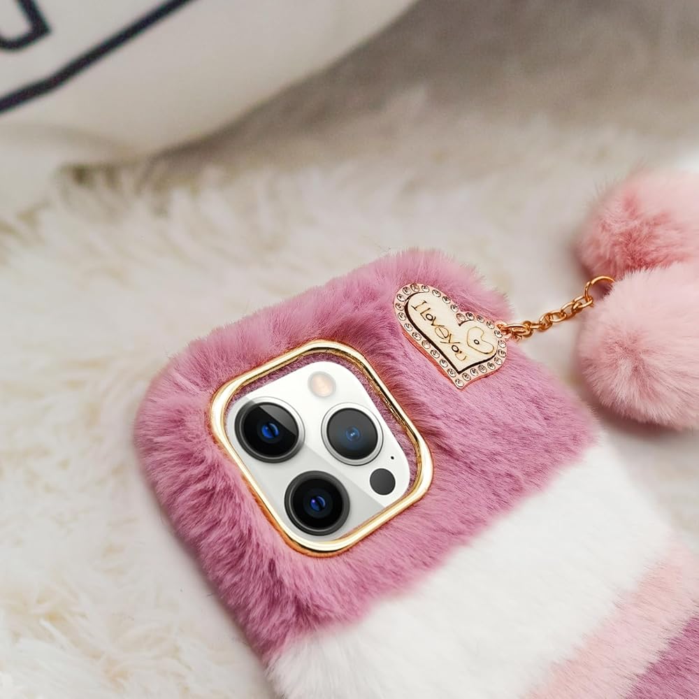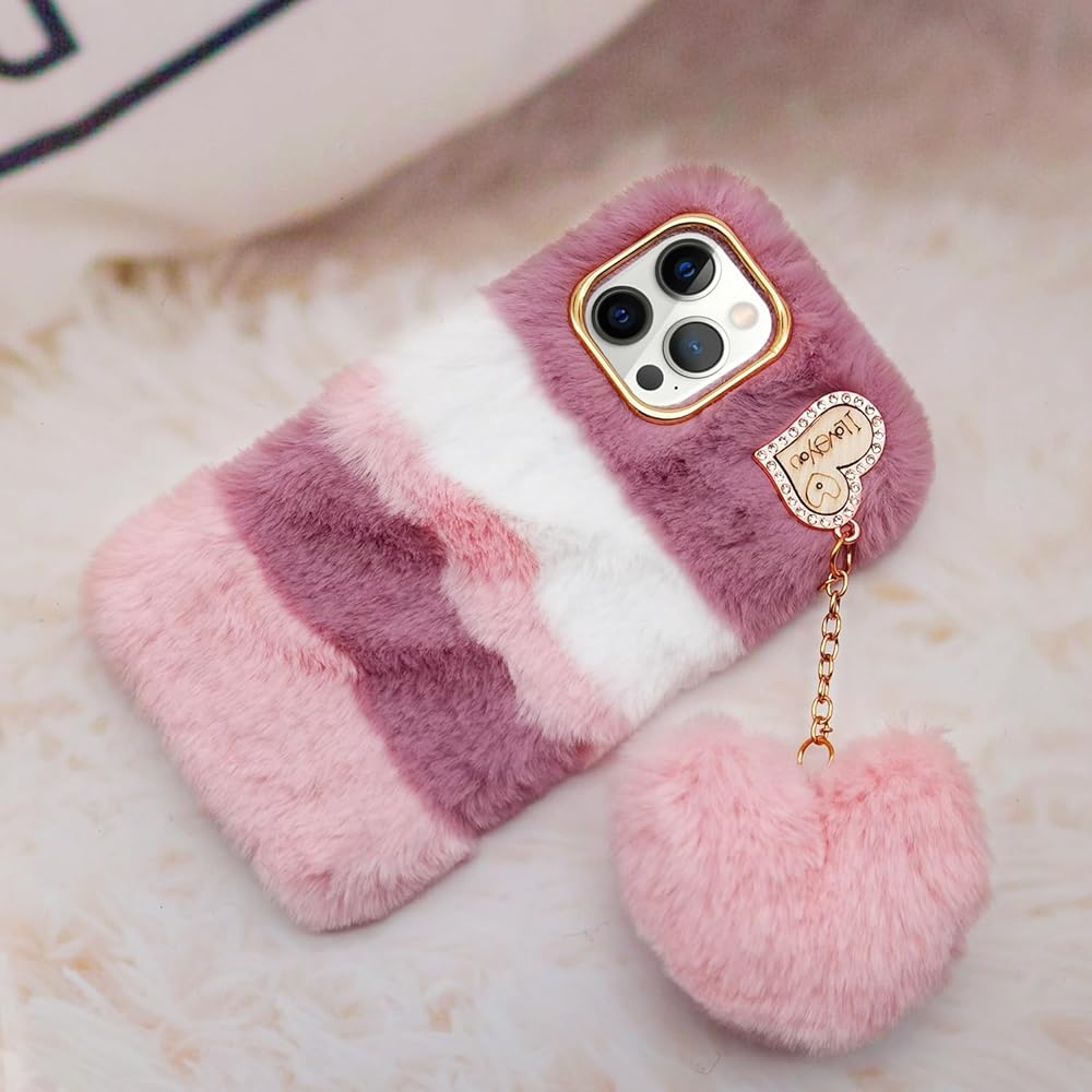 Compatible with iPhone 16 Pro Max Plush Furry Case with Cute 3D Love Heart Fuzzy Ball
