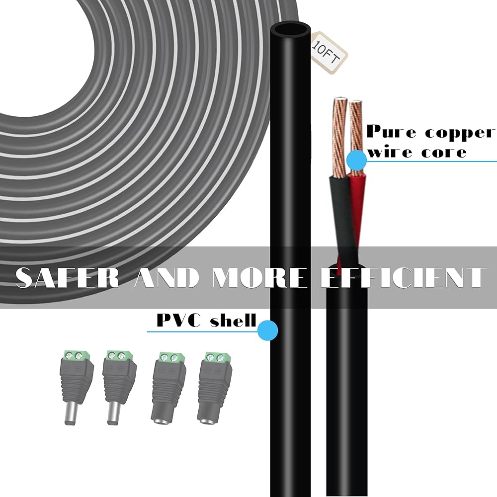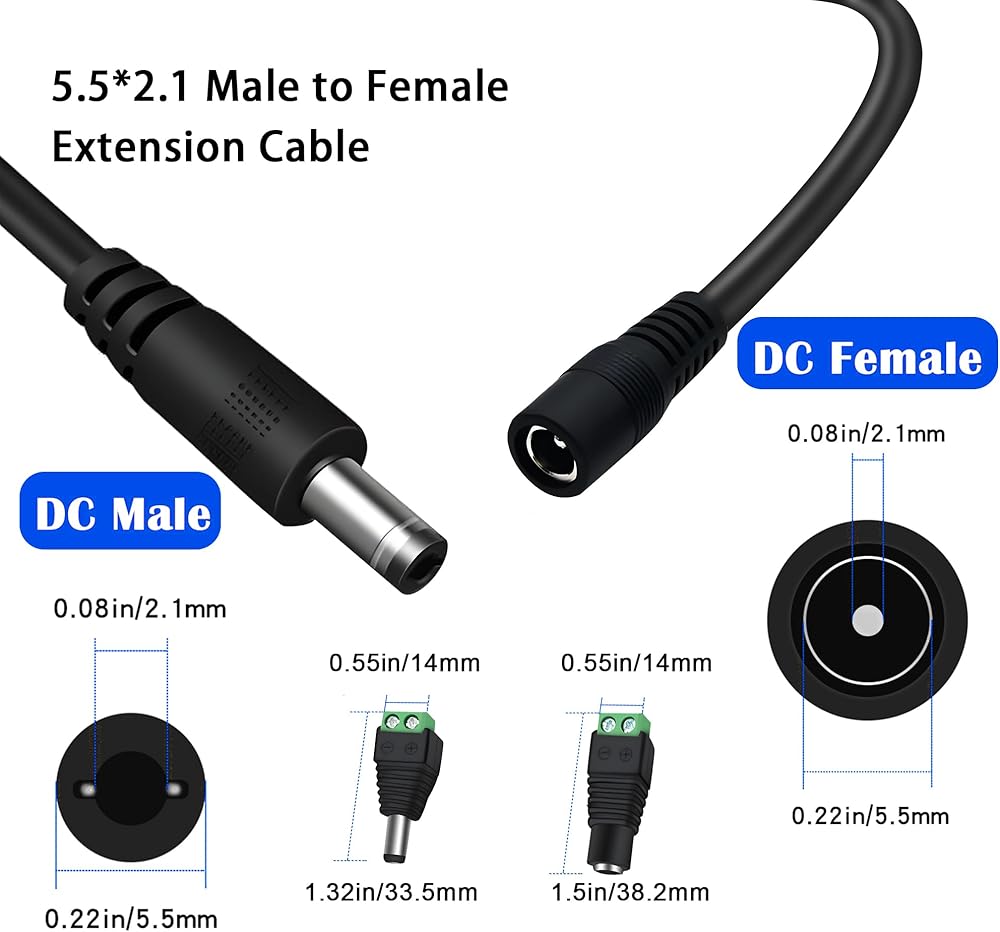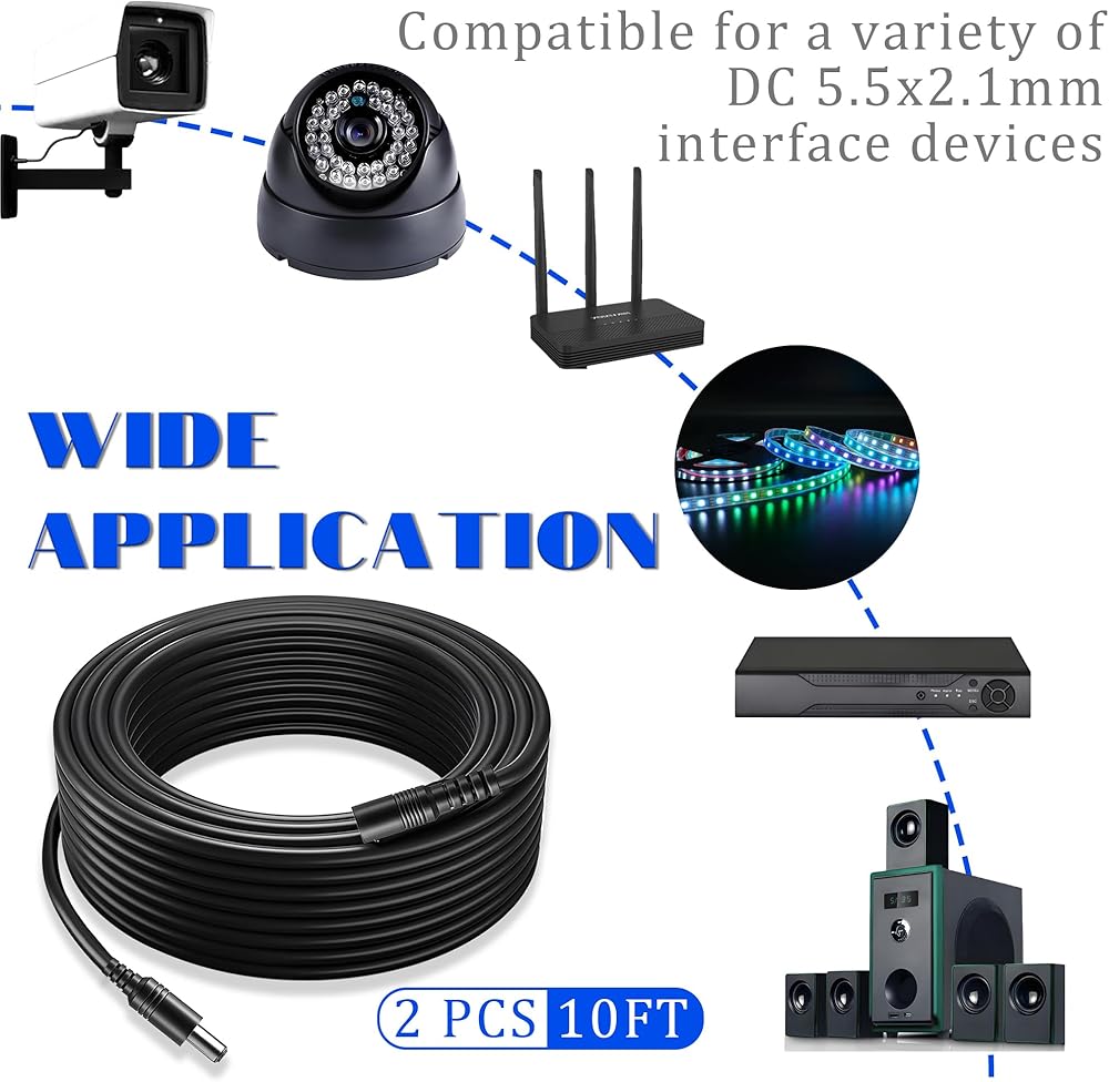 Package:2 pcs 10FT(3M) 12v Dc Power Extension Cable(5.5 x 2.1mm) and 4pcs 12v dc power jack adapter connectors(2 female and 2 male)