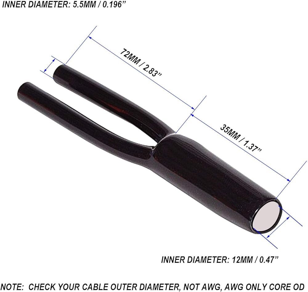 【Cable Pants/ Speaker Wire Pants Dimension】Inner OD:12MM - 2x 5.5MM/ 0.472"- 2x 0.196", Recomend for Outer OD 10-12mm Cable For 12mm Terminal, Outer OD 3.5-5mm Cable For The 2 x5.5MM Terminal, CHEAK YOUR Cable Wire Outside OD, NOT AWG, AS AWG IS JUST THE CORE DIAMETER.