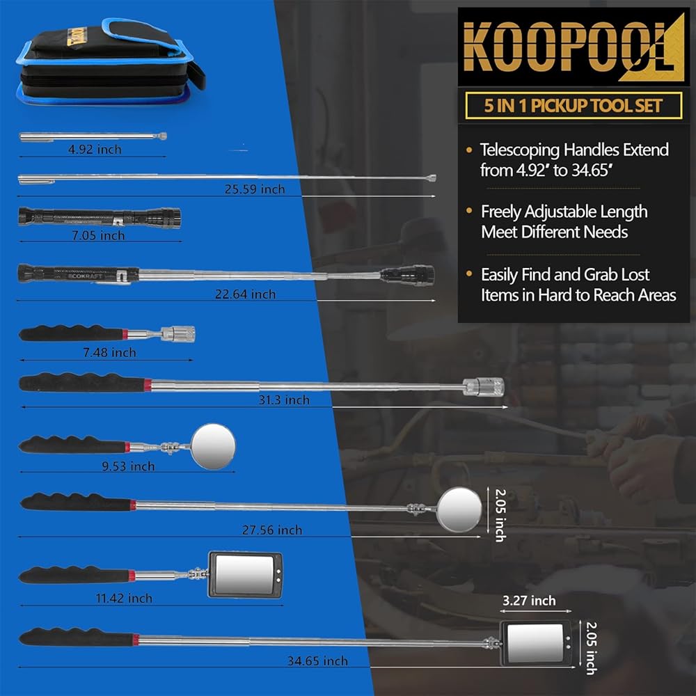 【TELESCOPING HANDLE】Made from aluminum alloy, making tools shockproof. Handles extend up to 34.65inch, help to grab lost items in far to reach areas. Anti-slip, oil-resistant plastic coating and ergonomic design, provides comfortable grip and more effortless use.