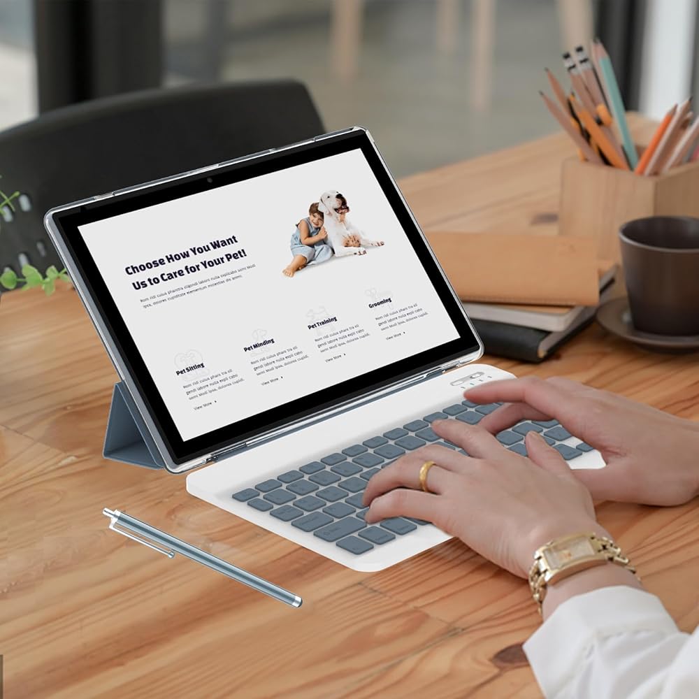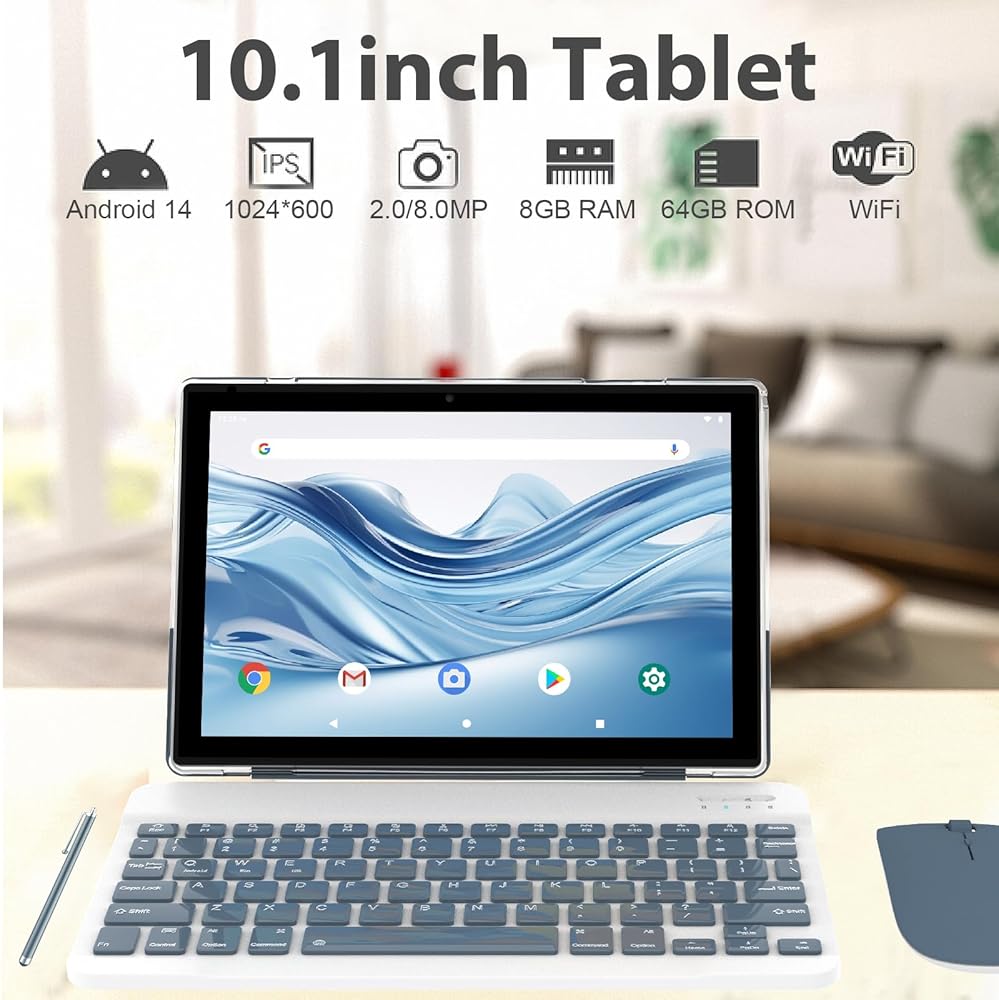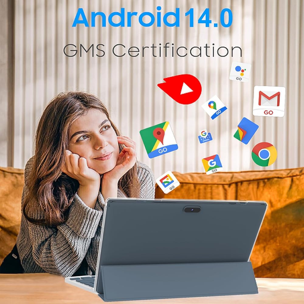 【Portable 2-in-1 Tablet PC】 Android 14 Tablet has passed GMS certification,tablet comes with bluetooth keyboard, wireless mouse and foldable protective case, it can flexibly turn tablet into a laptop mode or computer mode. By connecting the keyboard and wireless mouse through Bluetooth, it becomes an ultra portable mini laptop, perfect for home, school, and office use. Enables you to work and learn efficiently and quickly handle daily tasks, offers you limitless features and capabilities