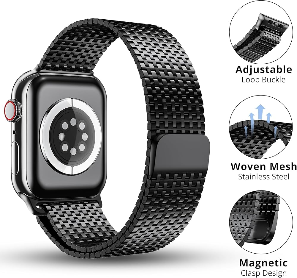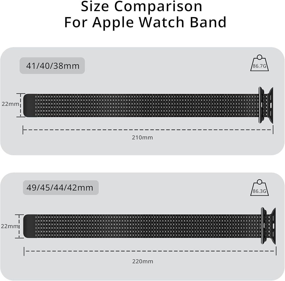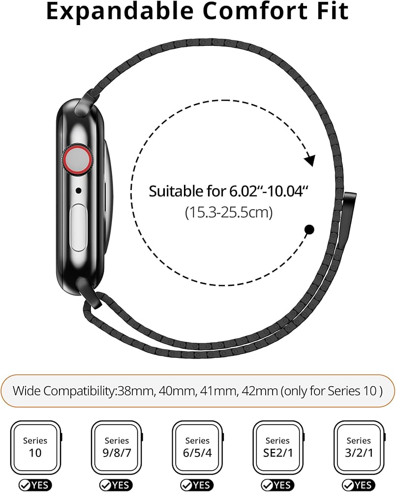 Wide Compatibility: The LULULOOK stainless steel mesh loop watch band is fully compatible with all models of Apple Watch, including 38mm, 40mm, 41mm, and 42mm iWatch Series 10/9/8/7/SE/SE2/6/5/4/3/2/1. Every last detail of this band is handcrafted, making it an excellent replacement for iWatch bands. Adopted with premium 630 stainless steel, it is the perfect replacement for all styles of iWatch wrist bands and fits wrist sizes ranging from 5.9" to 9.7" (15cm to 24.5cm);