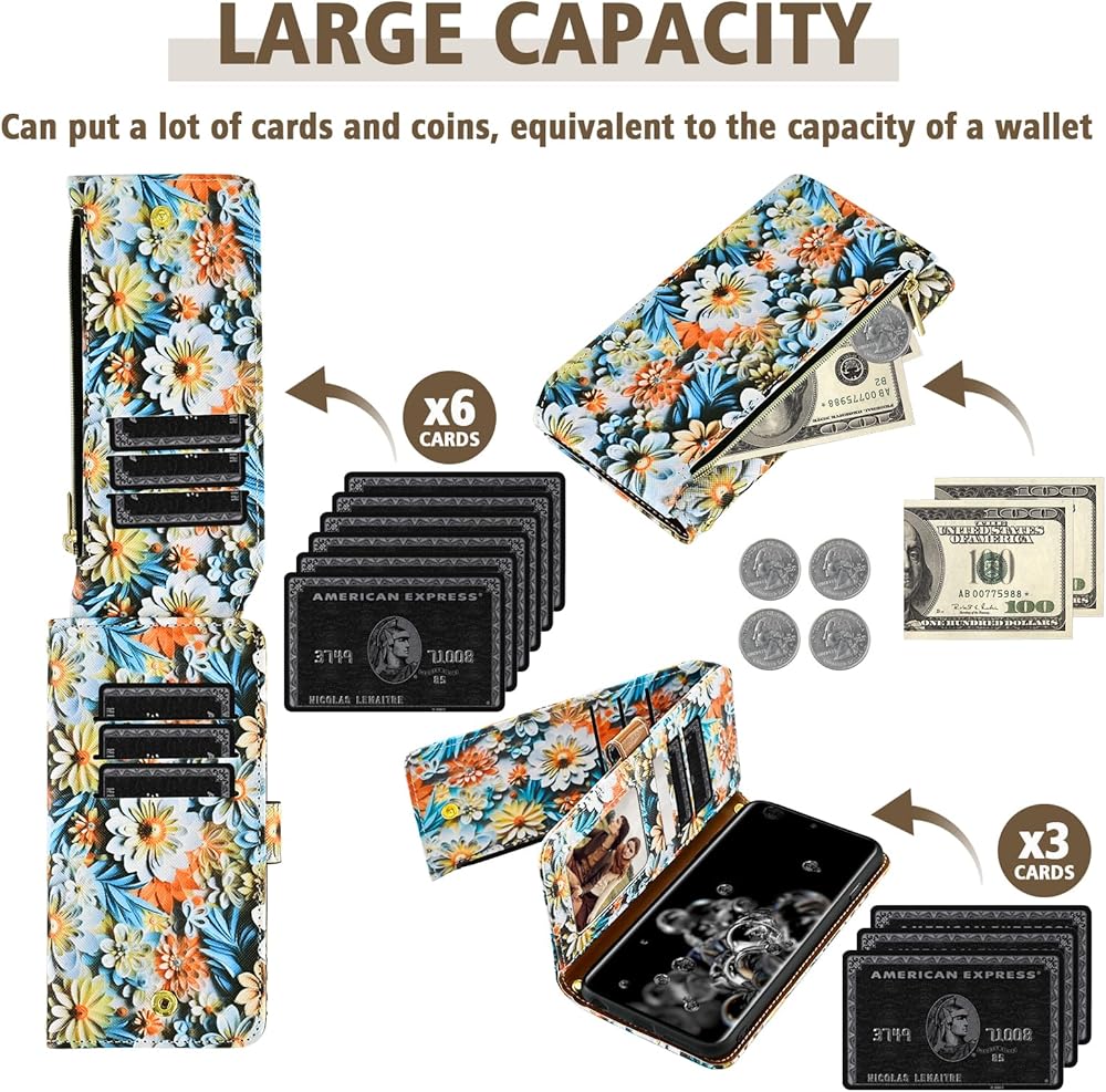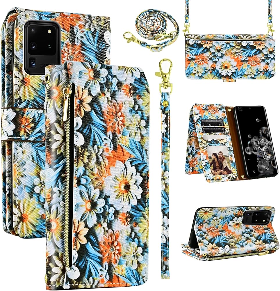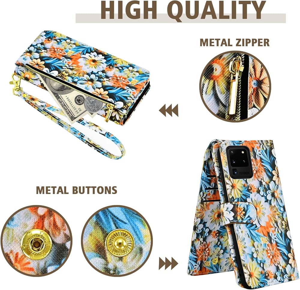 Wallet Case for Samsung Galaxy S20 Ultra 5G with Wrist Strap Shoulder Strap, 9+ Card Slots Zipper Floral PU Leather Stand Cell Phone Cover for S20ultra 20S S 20 A20 S2O 20ultra G5 Women Brown