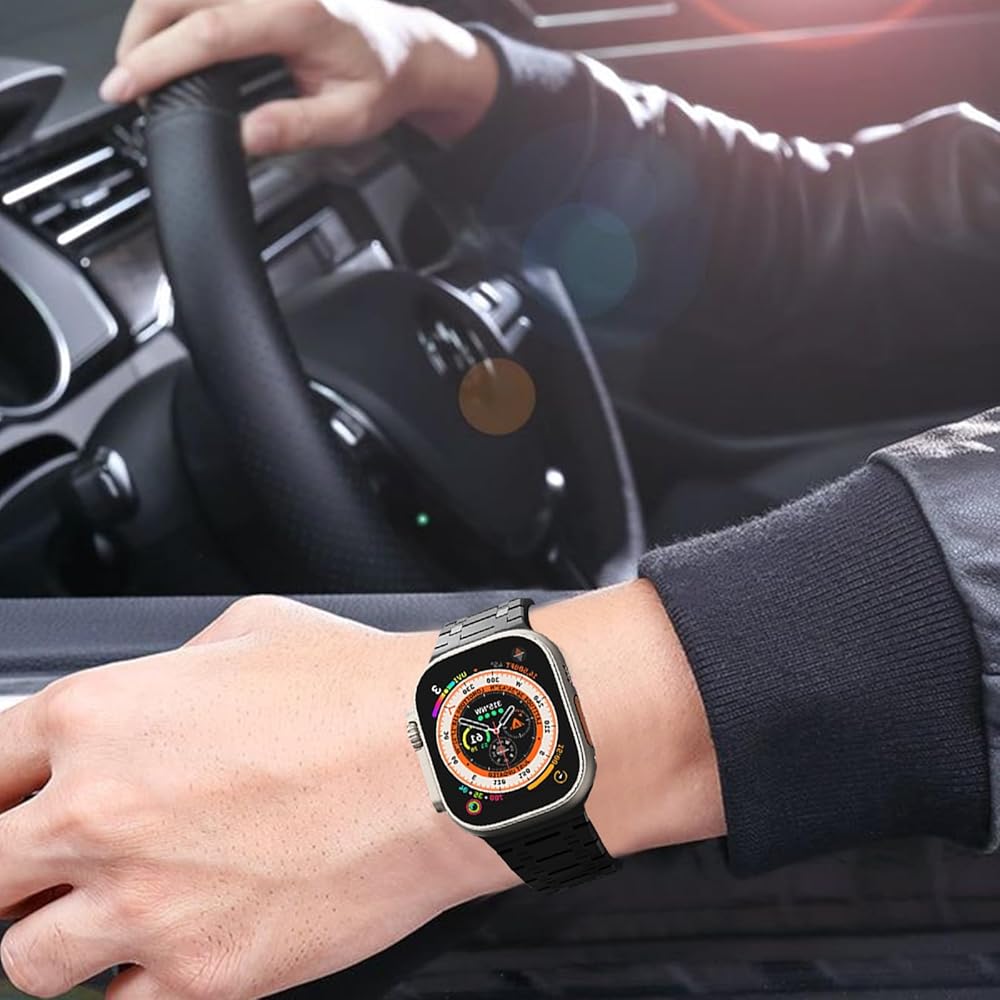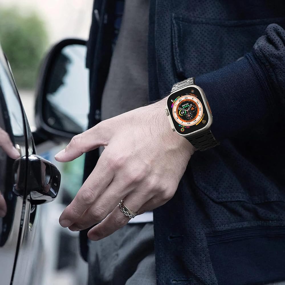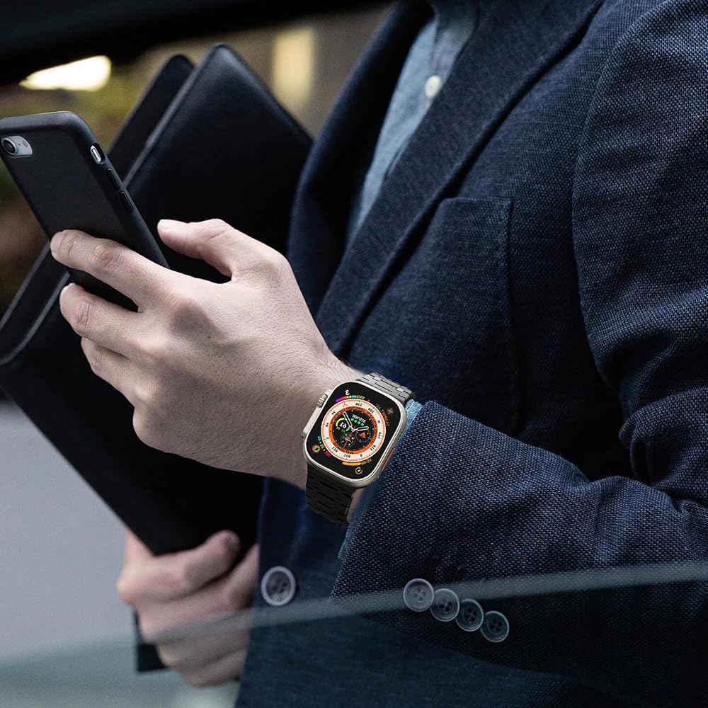【Premium Stainless Steel Bracelet with Titanium Finish Layer】Same color with the Titanium Apple Watch Ultra/Ultra 2. Made from upgrade satin-brushed stainless steel material with secure hidden folding buckle, crafted from superb polishing and electroplating process with advanced workmanship. The masculine, strong and clean lines design with glossy finish of the band makes a minimalist aesthetic, more conspicuous.