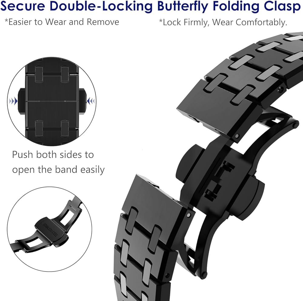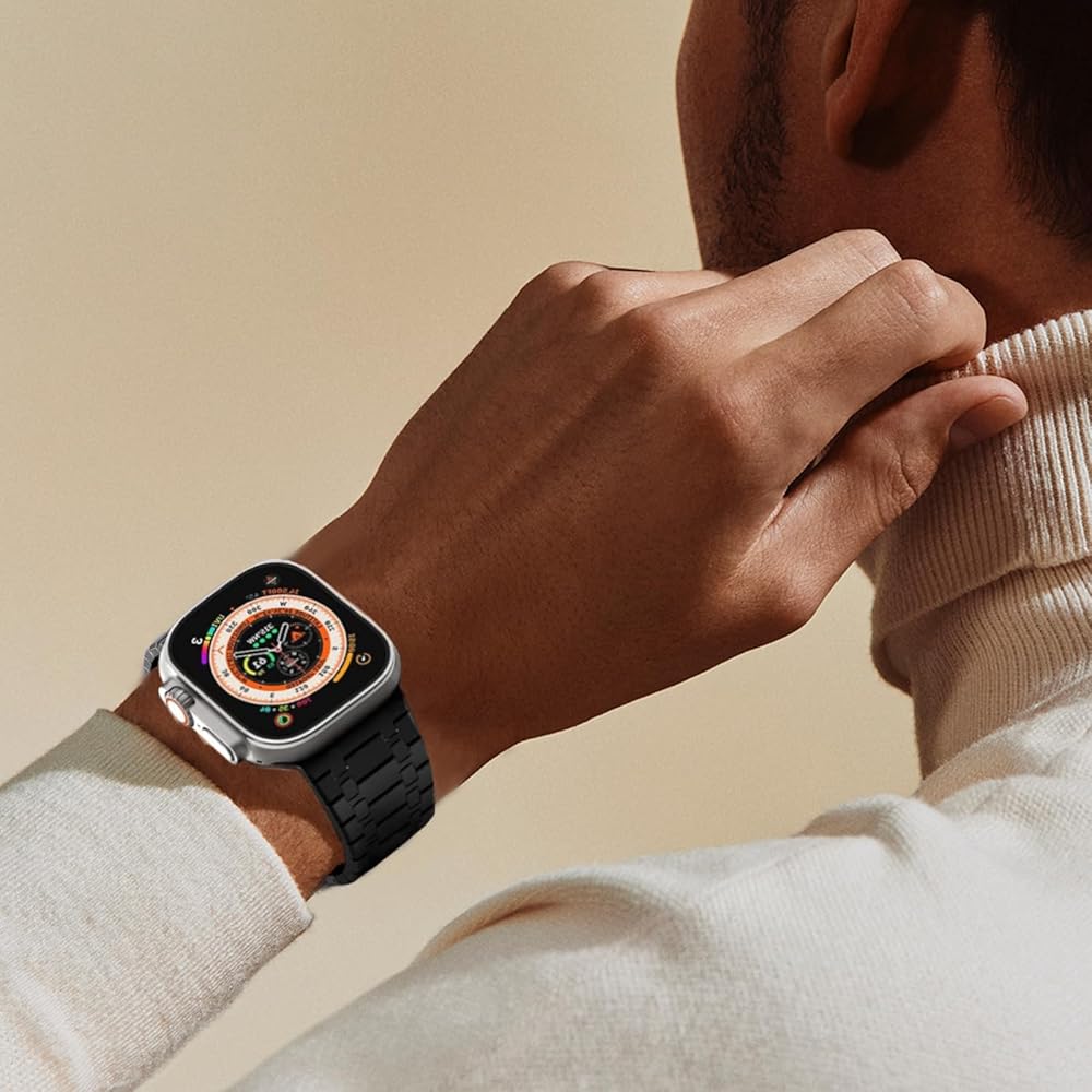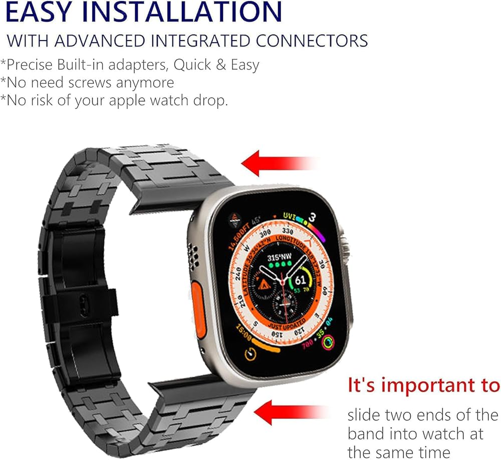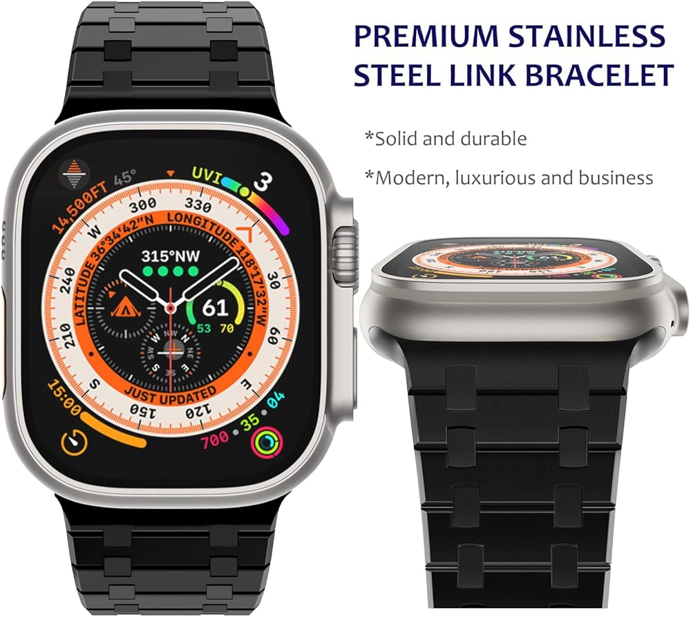【Premium Stainless Steel Bracelet with Titanium Finish Layer】Same color with the Titanium Apple Watch Ultra/Ultra 2. Made from upgrade satin-brushed stainless steel material with secure hidden folding buckle, crafted from superb polishing and electroplating process with advanced workmanship. The masculine, strong and clean lines design with glossy finish of the band makes a minimalist aesthetic, more conspicuous.