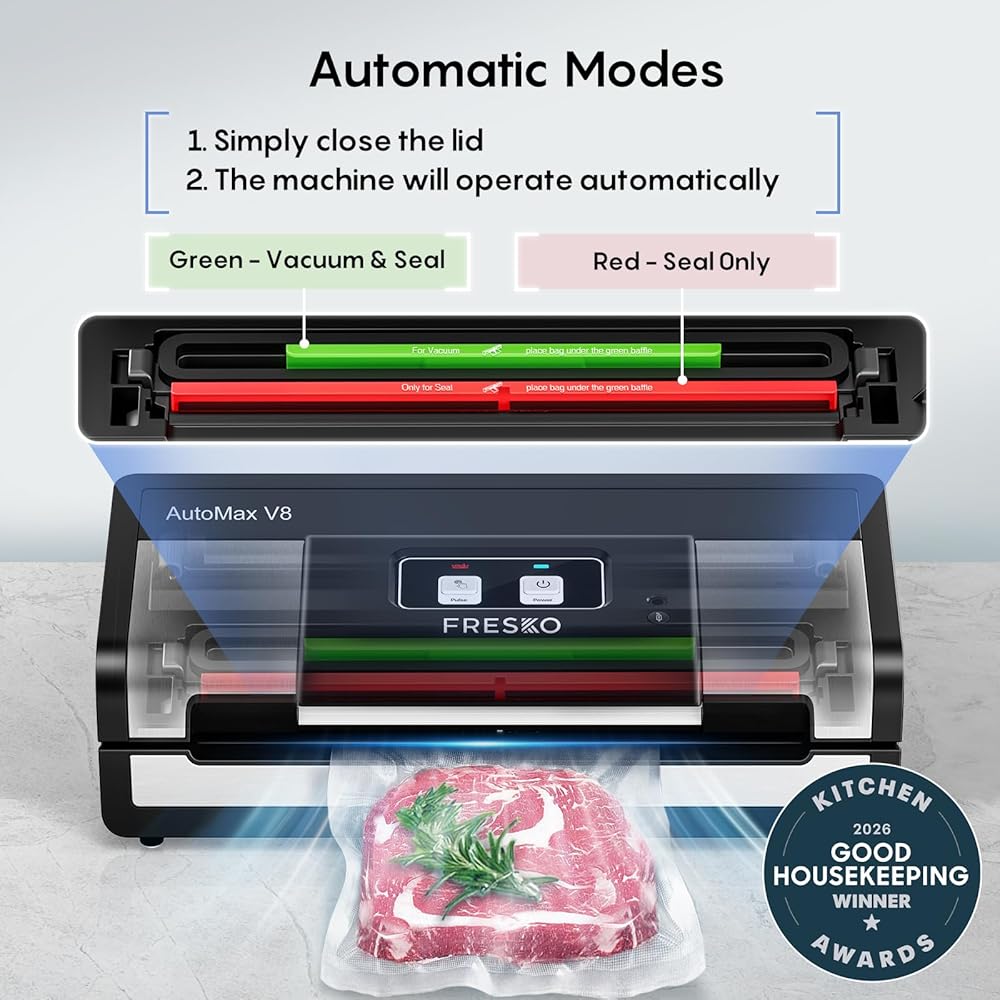 【Superior Performance】This Fresko AutoMax vacuum sealer features a powerful 140W motor, delivering a robust suction of 18L/min to effectively remove air. It can seal up to 50 bags continuously in just 20 minutes, perfect for bulk food preservation, saving you both time and money.