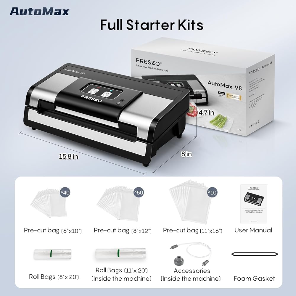 【Fully Starter Kits】Enhance your culinary journey with our comprehensive starter kit, which includes a vacuum sealer, a foam gasket, two roll bags (8” x 20'& 11” x 20' ), two external vacuum accessories, and a user manual. Fresko offers lifetime technical consultation, and is committed to providing users with high-quality service. Our local customer service team is available 24/7 to assist you.