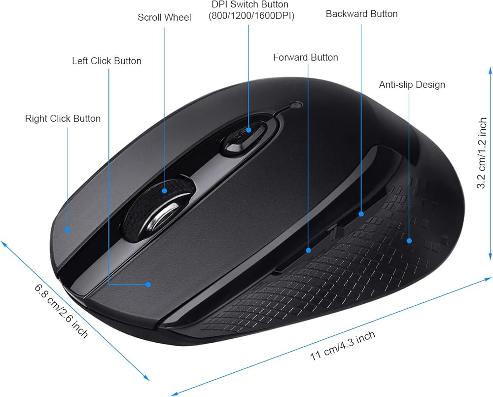 Plug and Play: 2.4G wireless mouse only needs to take out the USB receiver and plug it into your device to use, the operation is easy and fast. The computer mouse has 3 adjustable DPI (800/1200/1600), through real-time adjustment of the DPI, accurate and fast tracking, perfect for your work/entertainment needs.