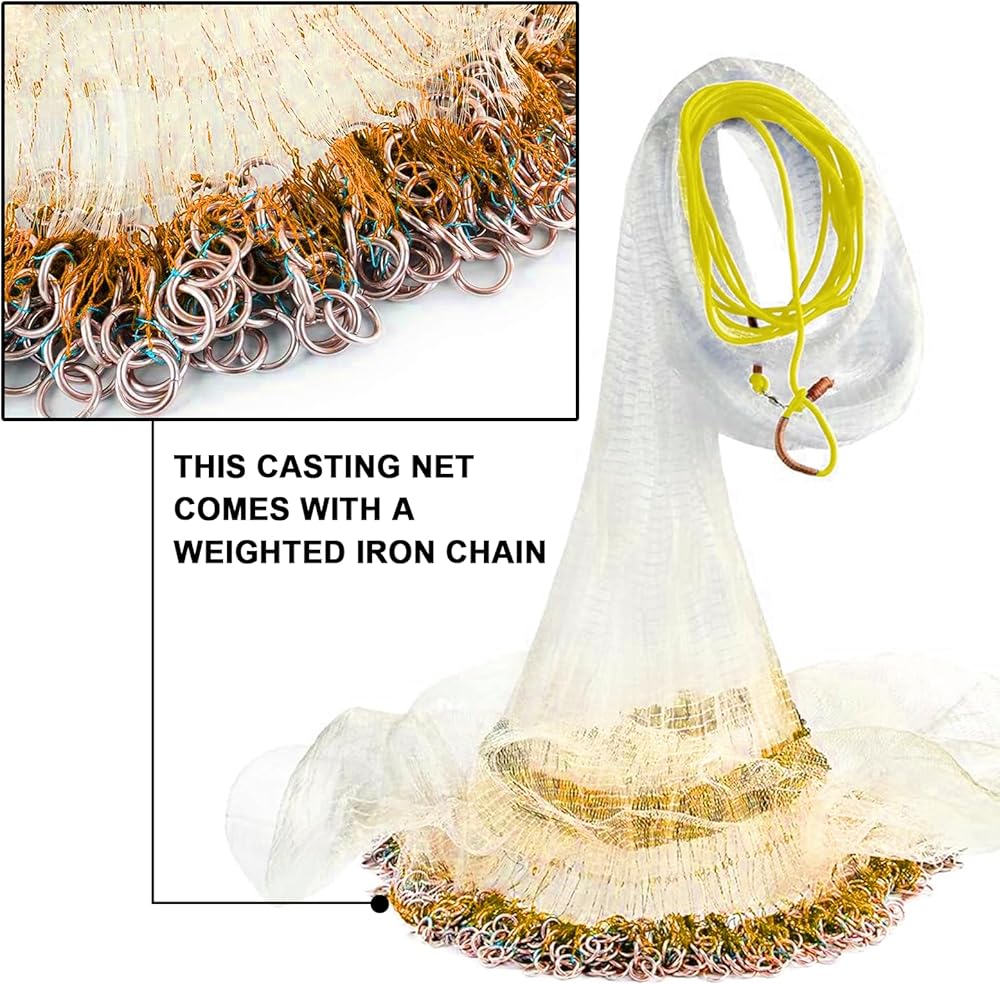 This casting net comes with a weighted iron chain. Equipped with a 1 pound iron chain lead per foot, which reduces the size of the spray when the net is thrown into the water, and makes the net sink quickly in the water.