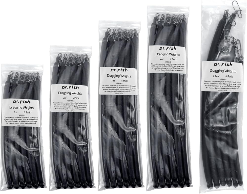 Dr.Fish dragging weights are designed for catfish trolling. It's made with steel shot with heat shrink tube. Top half of the tube are hollow to allow these sinkers float a little and avoid snagging. Steel shots inside generates extra noise for attraction. Comes in 1-4 ounces, they are compatible with most depth and water situations. 6 in a pack.