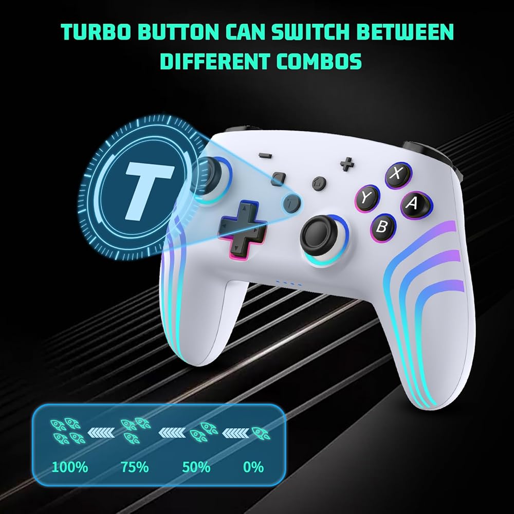 Enhanced Gameplay Features:The controller's non-slip texture and 8 LED colors provide a comfortable and stylish gaming experience. The TURBO button lets you switch between combos for a competitive edge. Additionally, with the TURBO function and the right 3D rocker, you can increase or decrease the speed of continuous shooting by one gear, providing customizable settings for your gaming preferences.