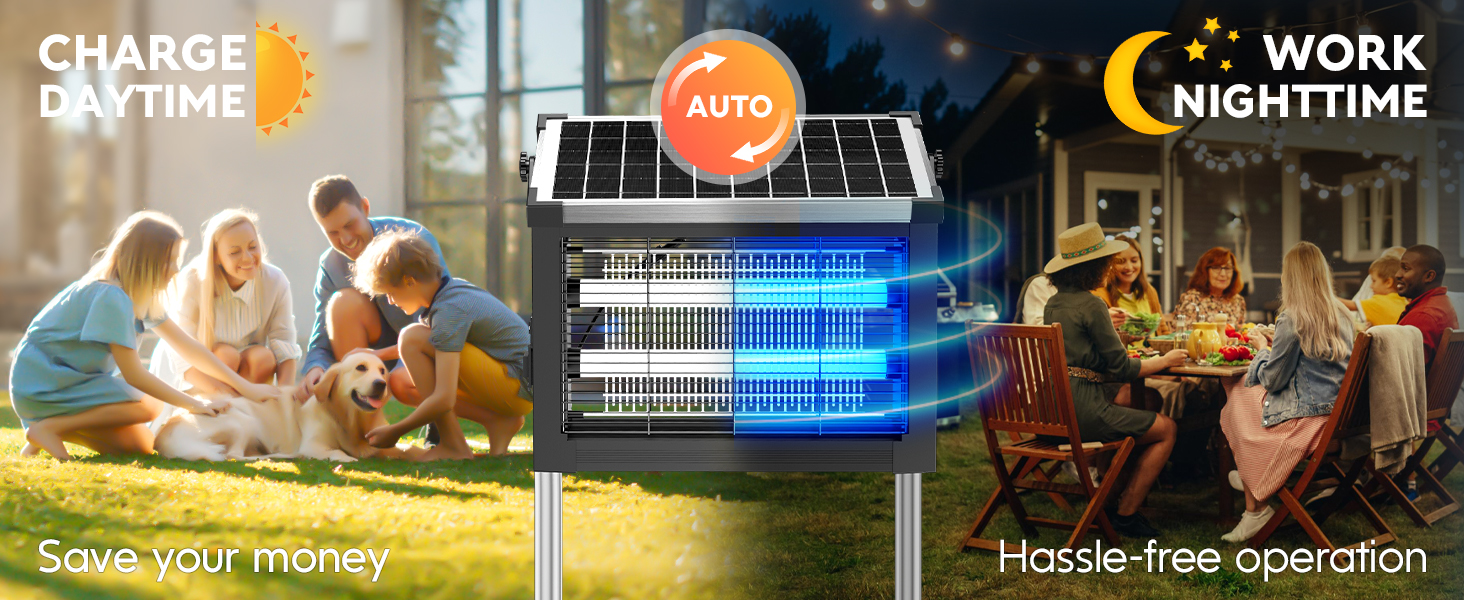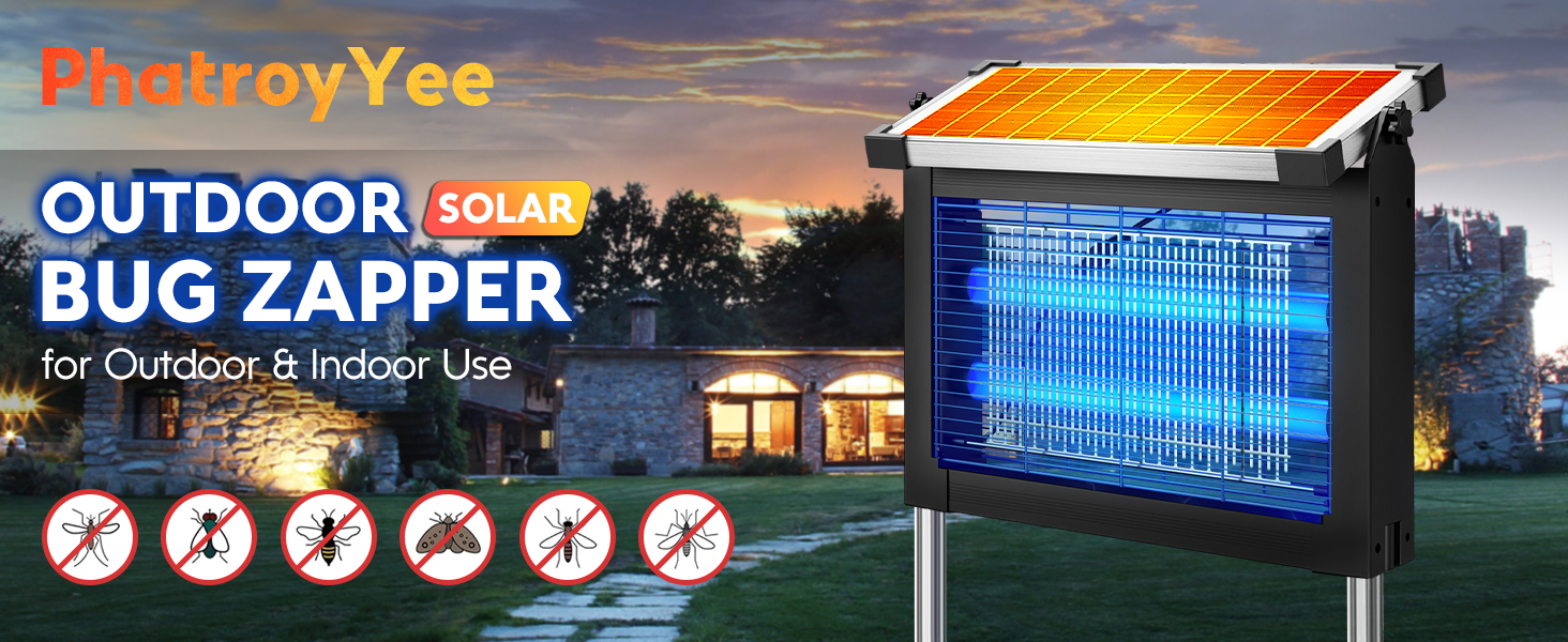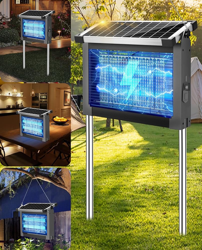 4-in-1 UPGRADED SOLAR BUG ZAPPER - Bug zapper combines 4 functions in 1: Solar Bug Zapper,Outdoor Indoor Bug Zapper, Portable Cordless Fly Zapper, Camping Bug Zapper. Solar power design features to utilizes solar power for hassle-f r e e operation, it effortlessly attracts & eliminates a wide range of annoying flying pests, like gnats, mosquitoes, flies, moths, bees, wasps, etc. Our mosquito zapper doesn't use any chemicals and will not emit irritating odor, which is harmless to human and pet