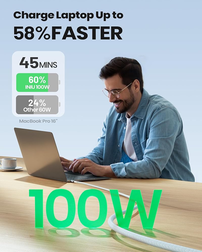 [Charge Laptop 58% Faster Than 60W] The all-new 100w usb c to usb c cable tech takes charging speed to the next level. Fast charge your macbook pro 16” to 60% in just 45 minutes—58% faster than using a 60w cable.
