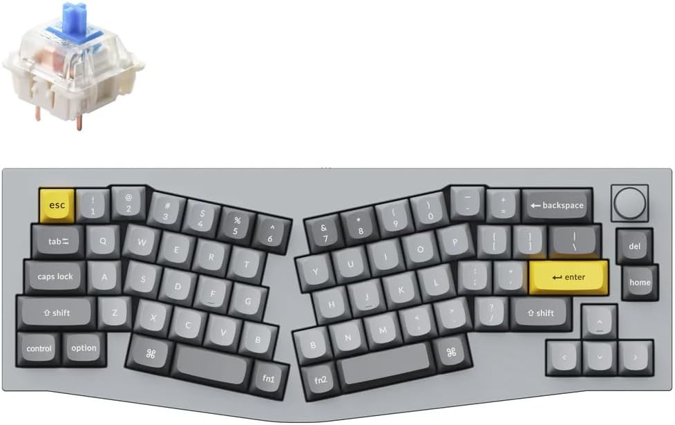 Ergonomic Design: Keychron Q8 is an all-metal mechanical keyboard with a 65% Alice layout. The keyboard is divided into left and right halves for balance, and the curved split key frame allows for more natural typing, working all day, reducing wrist fatigue and forearm muscle tension. With the aluminum CNC machined body, dual joint design and QMK/VIA support, the Q8 is designed for premium writing comfort.
