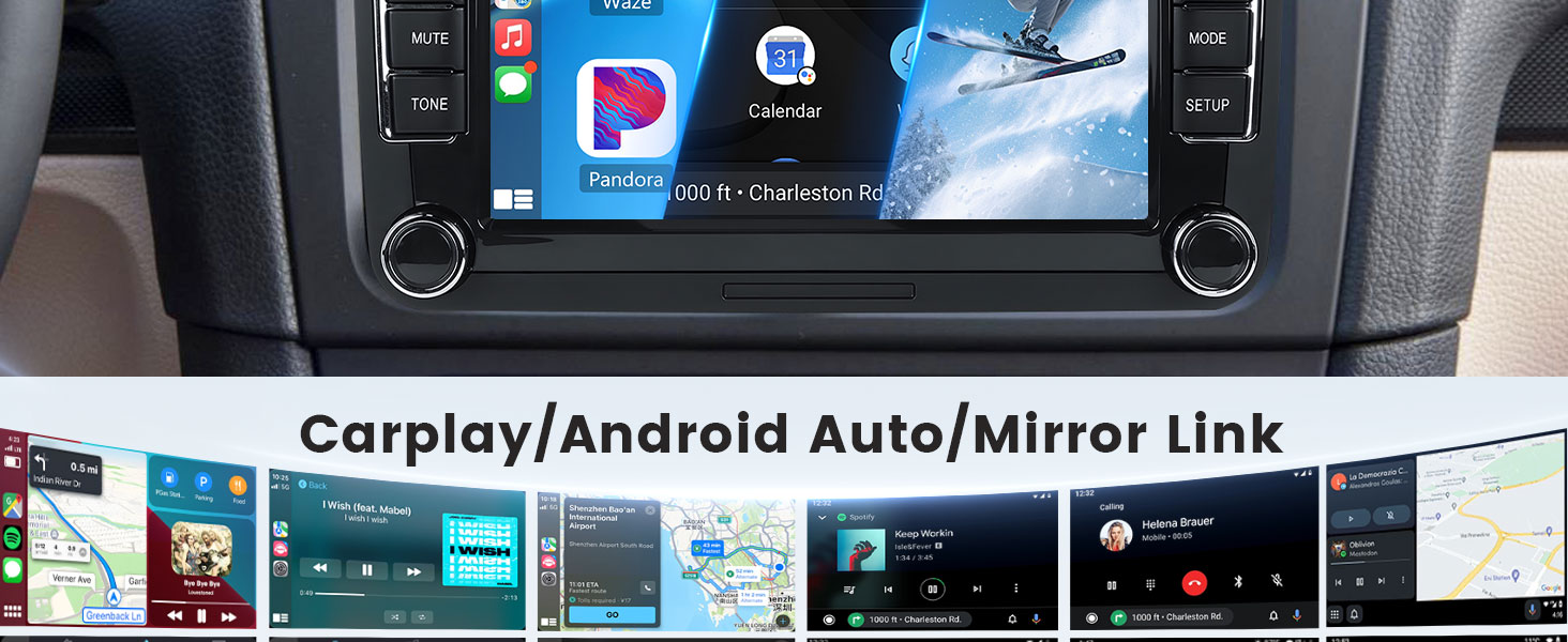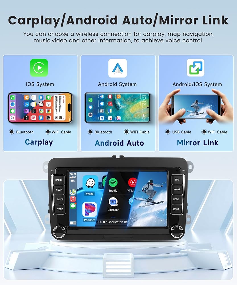 Wireless Carplay & Wireless Android Auto & Mirror link: for VW Seat radio Sport car radio support use iPhone or Android phone wirelessly with the device, and control your phone's apps. can make calls, send messages, play music, navigate with just your voice or touch. for Nissan Altima car radio support IOS/Android mirror link, use USB cable or WIFi, mirror your phone's screen on the device's display, You can use your phone's apps, music, videos, etc on the device.
