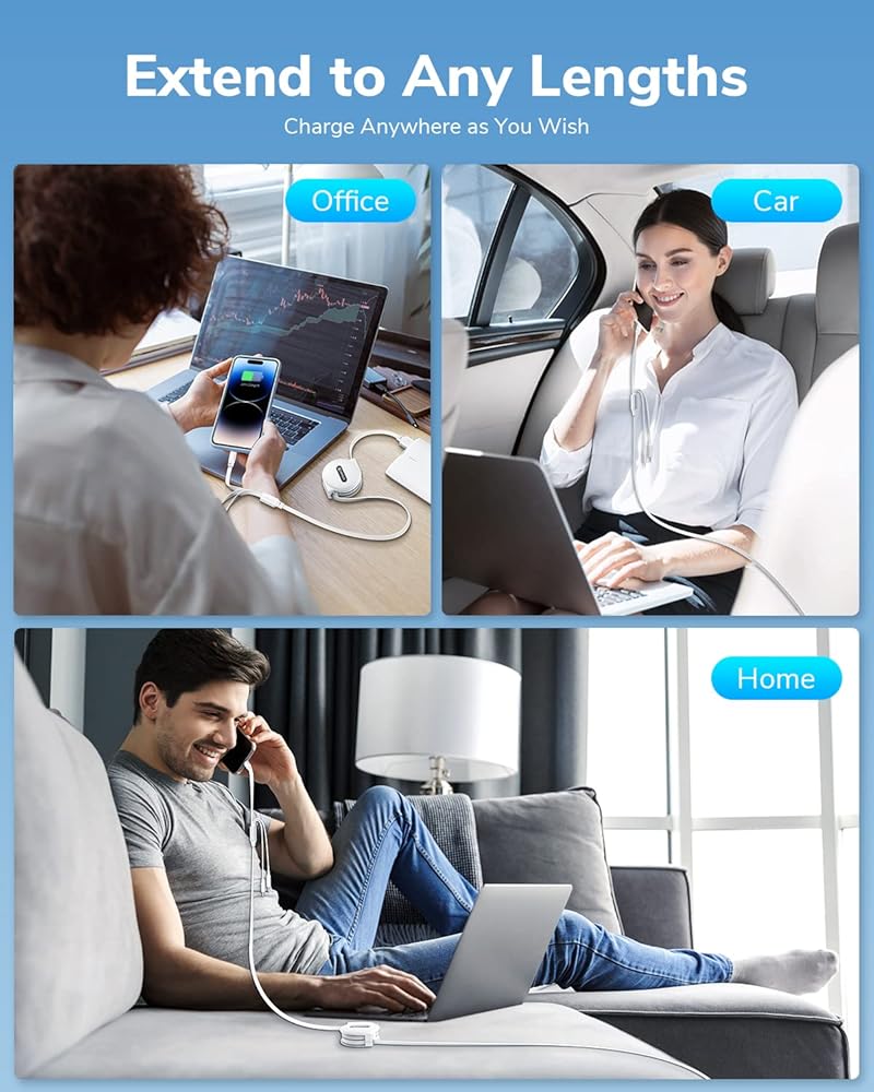 【Portable & Retractable】Available anytime, anywhere. CAFELE retractable charging cable offers 5 adjustments: 0.6ft-1.6ft-2.3ft-3ft-4ft. Adapts to different charging distances: at home, office or in car. After use, pull out both sides of the cable at the same time, it will automatically retract to the original position. Easy to place in your handbag, backpack, or pocket.