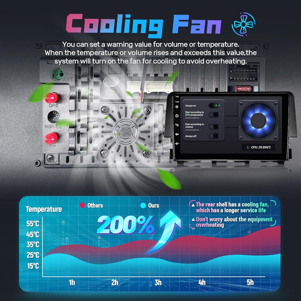 Upgraded Civic Stereo: Equip with intelligent cooling system; Four modes available; By presetting the CPU temperature or volume, the cooling system will start intelligently when the car stereo overheats; Effectively cools the head unit and prolongs its service life; Greatly saves energy consumption; AHD rear view camera with night vision and 170° wide-angle functions; High-definition and waterproof; Automatically and clearly display reversing images and lines in reverse mode for safe reversing