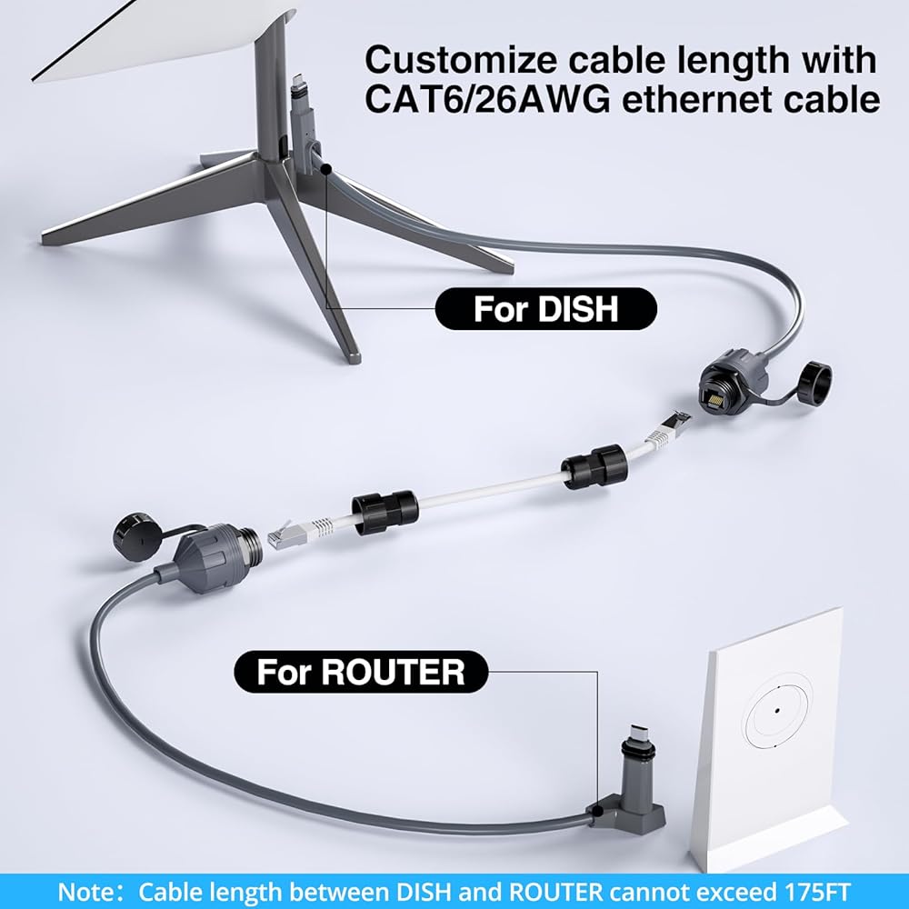 【Extension & Repair Kit】This kit includes both dish and router side SPX plug to female RJ45 adapter, provides modification options for your starlink device. Customize your Starlink cable length with CAT6/26AWG ethernet cable.