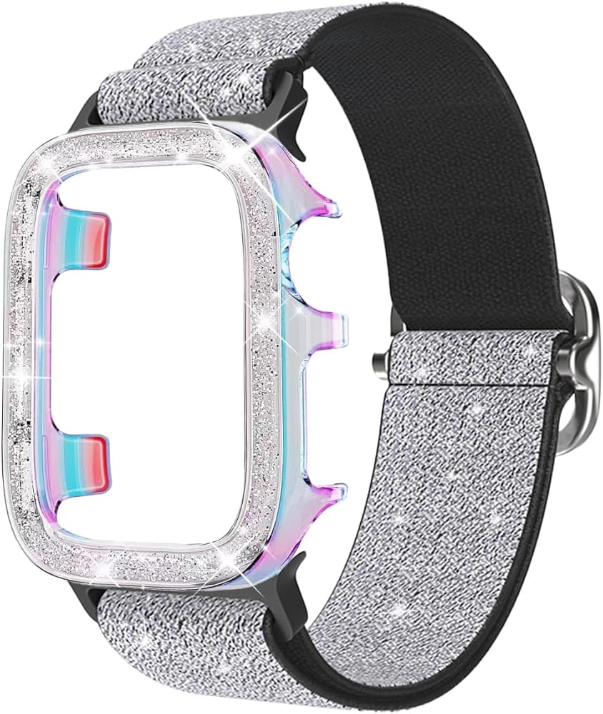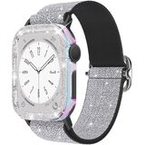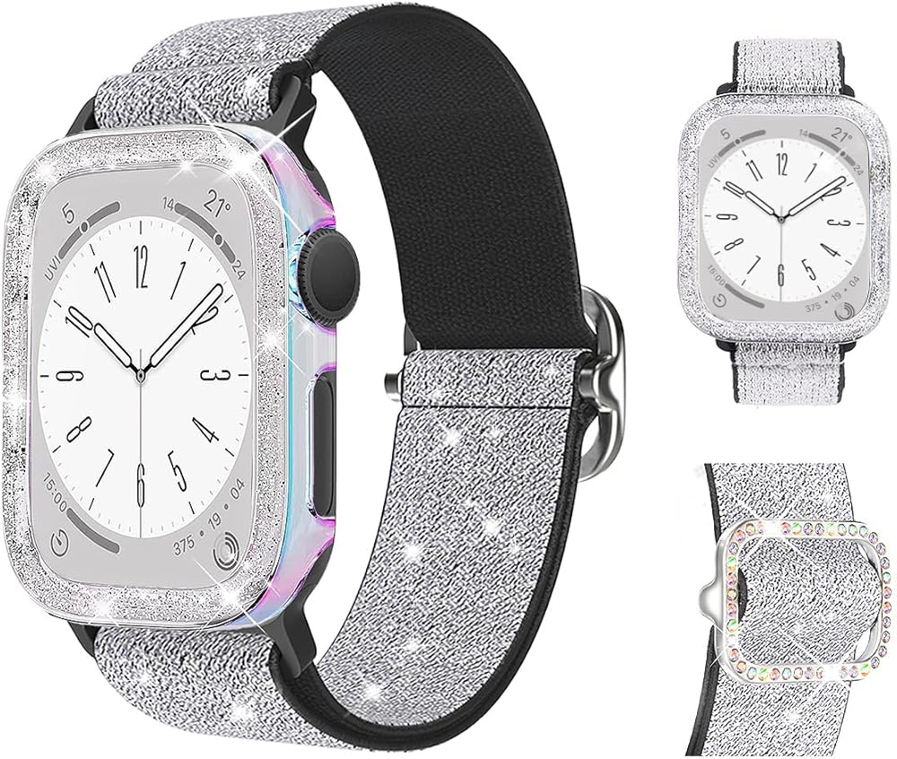 Stretchy Band and Bling Bumper Case Compatible with Apple Watch 40mm 38mm 41mm 42mm 44mm 45mm 46mm Women, Elastic Nylon Straps and Glitter Protective Frame for iWatch Series 11 10 9 8 7 6 5 4 3 2 1 SE