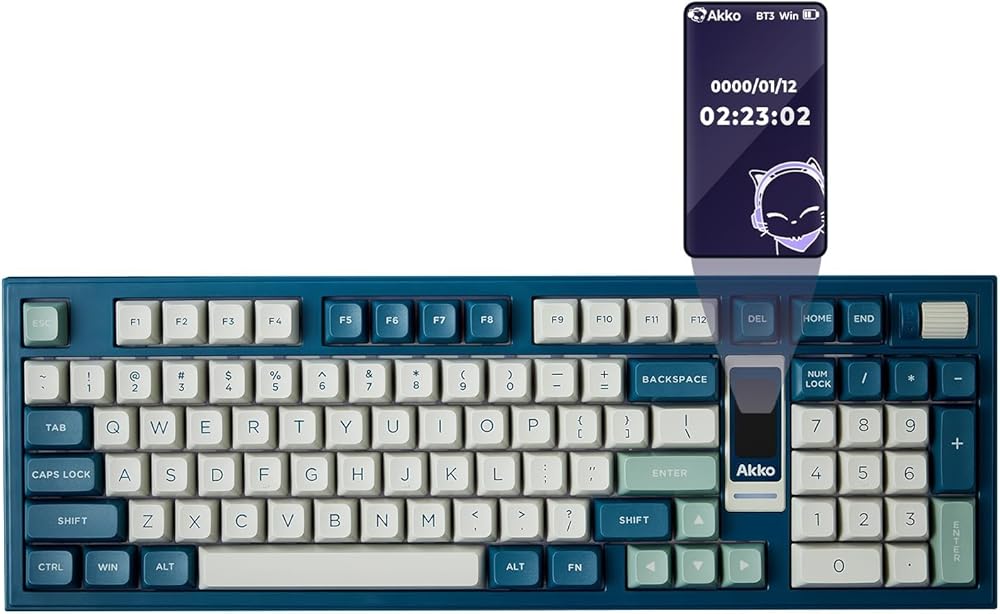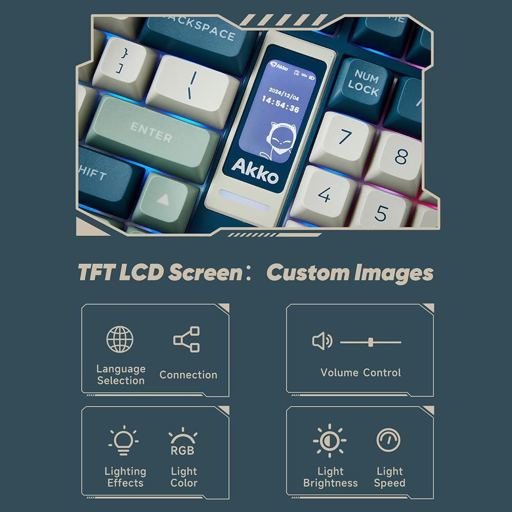 The Larger, the Better: You can use this 1.47”TFT LCD screen to control backlighting, connection modes, and language settings with the Akko Cloud Driver (compatible with Mac, Windows, and Web). You can easily upload your favorite emojis, giving your keyboard a personal touch like never before! The Scroll Wheel can be used for controlling volume, pause/play, and the LCD screen with a simple Fn+ click switch