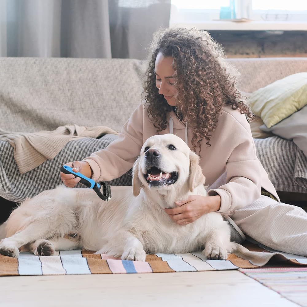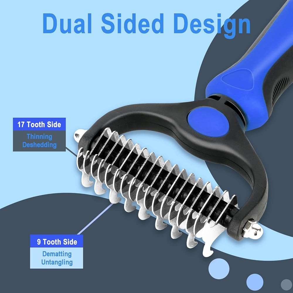 【2-in-1 Dual-Head Design】Start with 9 teeth side for stubborn mats and tangles and finish with 17 teeth side for thinning and deShedding. Achieve faster and more professional Dematting and grooming results. Best pet brush for medium to long-haired dogs & cats.