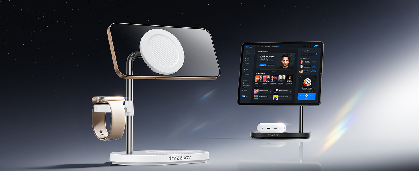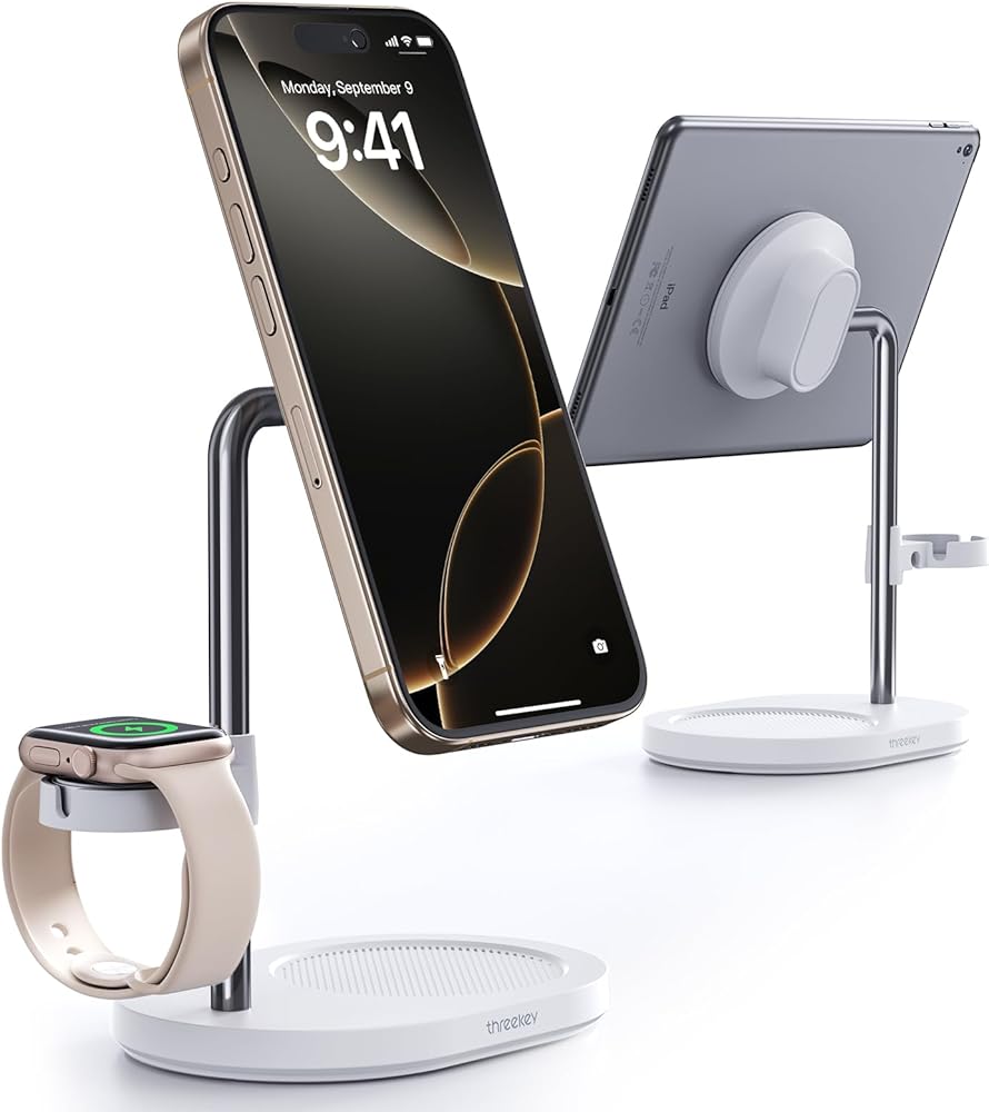 【Elegant and Integrated Design】3-in-1 magnetic desktop stand combines sleek lines and an integrated design, offering both an elegant look and a smooth touch. Not only does the phone stand serve as a stylish accessory, but it also provides a practical, multifunctional storage solution for your devices. Capable of securely holding your phone, watch, and earphone, THREEKEY magnetic stand helps keep your desk organized and space-efficient, enhancing both your productivity and daily life.