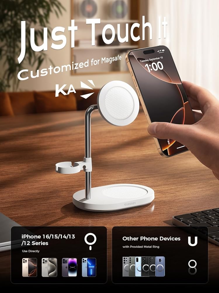 【Wide Compatibility】Phone holder for desk is designed for iPhone 16/15/14/13/12 series, as well as Magsafe phones and cases. Addtionally, we provide extra metal rings specifically for non-Magsafe devices, such as iPad series, Kindle and Samsung phones. Attach the metal ring to your device or case to ensure it stays firmly and safely in place.