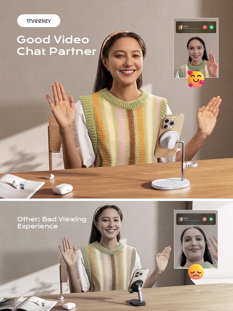 【Powerful Magnetic Force】THREEKEY Magnetic Phone Stand for Desk boasts a robust magnet, gripping MagSafe-compatible devices securely for swift, hassle-free attachment and detachment. The N52 magnetic core ensures your phone stays put. Perfect for iPhone 12 to 16 series, ideal for fitness, FaceTime, Zoom, and live streaming. This innovative design offers reliability,convenience and fashionability over traditional stands. Note: ♥Not compatible with MagSafe charging, just a stand!!!♥ Magnetic force may be very strong when used for the first time !!!