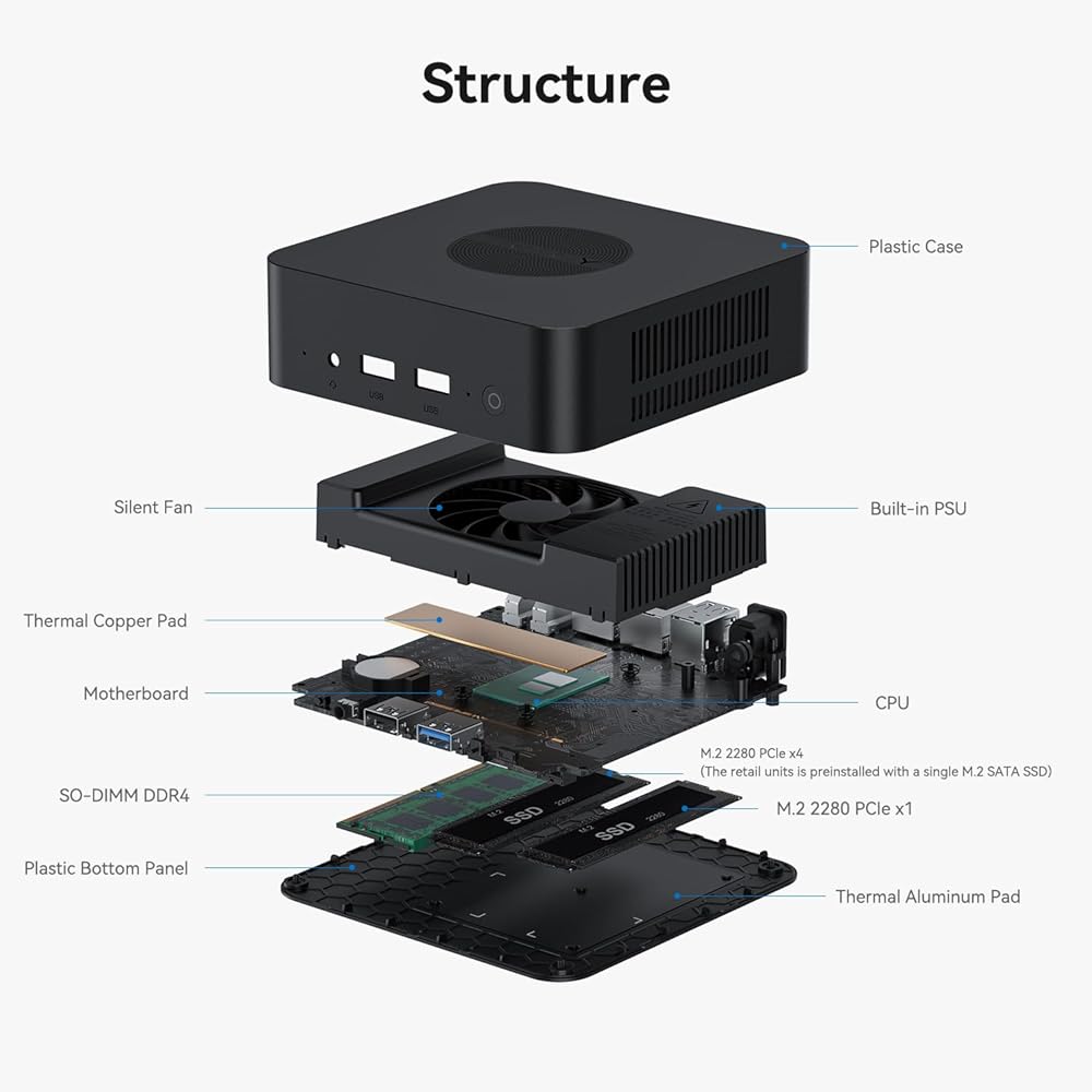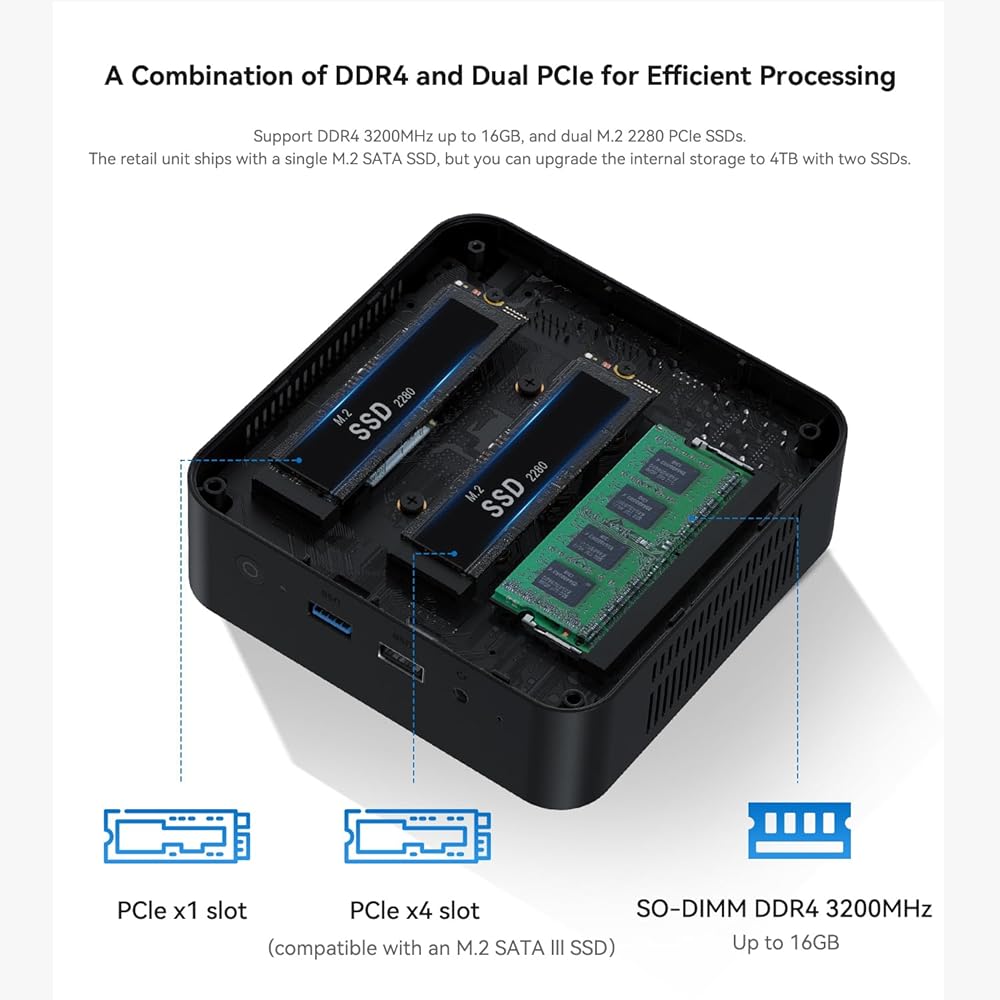 【Large Capacity & Freely Expand】The mini desktop computer has built-in dual-channel 32G (2x16GB) SO-DIMM DDR4 (3200MHz), which runs more smoothly in a larger space; its max memory can reach 64GB (2x32GB). Installed 500GB NVMe SSD expandable to 2TB via 2.5-inch 7mm SATA HDD (not included). More space for you to store data and download file applications. For your convenience, it is also pre-installed with W11 Po system (switchable Ubutun, etc.)