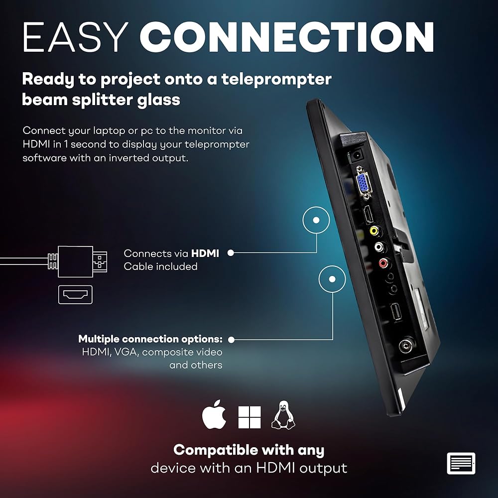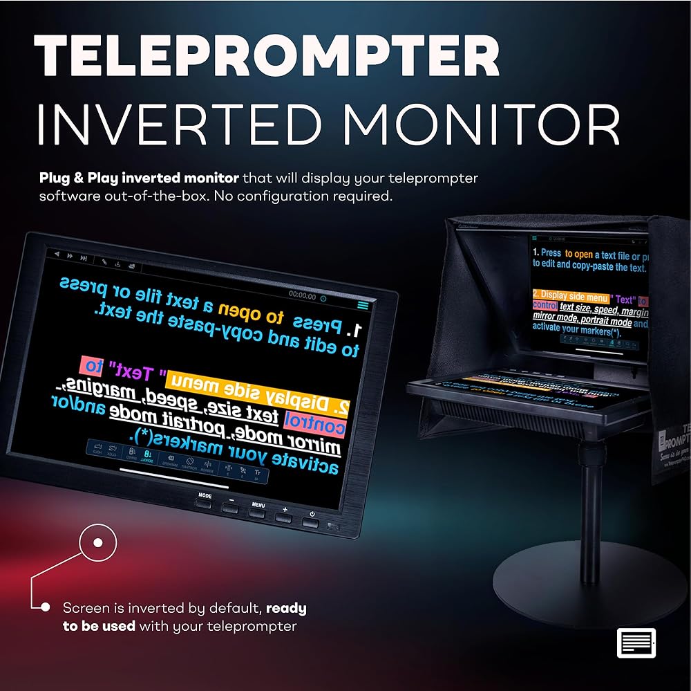 INVERTED TELEPROMPTER MONITOR: Enhance your teleprompter setup with the 12" inverted monitor, specifically designed to provide an efficient and user-friendly viewing experience for teleprompter applications. PLUG & PLAY COMFORT: Enjoy hassle-free operation with this inverted monitor that works right out of the box. No complex configurations needed: simply plug it in and start using it immediately for seamless teleprompter functionality. PERFECT FIT FOR iLIGHT PRO 12": Designed for iLight PRO 12" and compatible with any teleprompter that supports a monitor with dimensions of 25.5x16.5x3.5cm, this monitor ensures a perfect fit for a wide range of teleprompter configurations. IDEAL FOR ONLINE MEETINGS AND SCRIPT RECORDING: Enhance your video conferencing experience with correct mouse orientation, making navigation intuitive and easy. No additional equipment required: The inverted monitor provides the perfect setup for smooth online meetings. VERSATILE CONNECTIVITY OPTIONS: With multiple connection options including HDMI, VGA, composite video, and more, this monitor offers flexibility for various configurations.