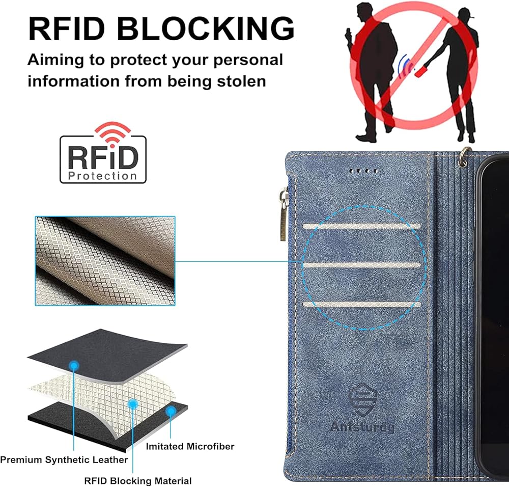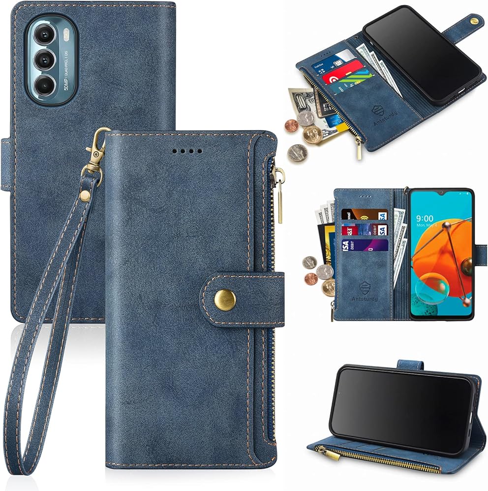 Antsturdy Wallet Case for Motorola Moto G Stylus 5G 2022 Credit Card Holder Women Men,PU Leather Flip Cover Wrist Strap Zipper Card Slots RFID Blocking,Phone Case for Moto G Stylus 5G 2022,Blue