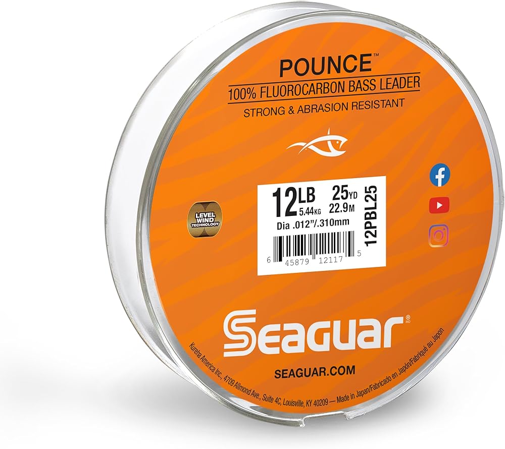 Pounce Fluorocarbon Bass Leader – Strong and Highly Abrasion Resistant, Excellent Impact and Knot Strength, Fast Sinking and Virtually Invisible Underwater. 25 Yard Spool. It's built to be bullet-proof and strengthen your leader connection with freshwater bass. This is a 100% fluorocarbon leader made with custom Seaguar fluoro resins in Japan. It's built tough with exceptional abrasion resistance and strength to help you fight back against docks, weeds and rocks – the places bass love to hide. It provides maximum impact and knot strength and is a fast-sinking line to get you in the strike zone faster. Pounce gives you excellent advantages versus monofilament and all the benefits of fluorocarbon at a price that everybody will love.