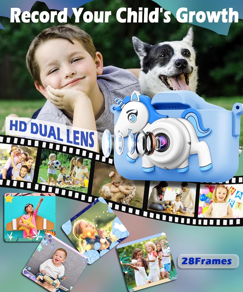 Long-Lasting Battery and Ample Storage: With a robust built-in rechargeable battery, this camera captures magical moments for 2-3 hours on a single charge. The included 32GB SD card stores up to 5,000 pictures, ensuring uninterrupted creativity. Enhance photos with 28 funny frames and 6 filters, creating personalized memories for your little photographer.