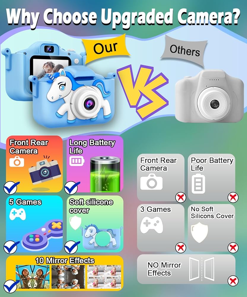 Dual-Camera Wonder for Kids:Our upgraded kids' camera, great for birthdays, Easter, and Christmas, boasts a dual-camera setup, making it effortless for little ones to capture selfies and more. The soft silicone casing guarantees a secure grip, allowing worry-free photography. The added lanyard ensures portability, enabling outdoor adventures for boys and girls aged 3-12.